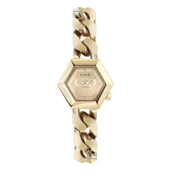 Entdecken Sie die Philipp Plein® Analogue 'The Hexagon Groumette' Damenarmbanduhr PWWBA0323, eine strahlende Ergänzung für jede raffinierte Kollektion. Dieses exquisite Zeitmesser ist für die moderne Frau konzipiert, die Eleganz und Selbstbewusstsein verkörpert. Das hexagonale Gehäuse besteht aus langlebigem Edelstahl und ist in einem luxuriösen Goldton veredelt, der das schicke Design perfekt ergänzt. Mit einem schlanken Durchmesser von 28 mm ist diese Uhr so auffällig wie tragbar und der ideale Begleiter für sowohl Tages- als auch Abendoutfits. Die Gehäusestärke von 9 mm sorgt für ein leichtes Tragegefühl am Handgelenk, während das polierte goldene Zifferblatt, geschützt durch ein robustes Mineralglas, einen schimmernden Akzent zum Gesamtbild hinzufügt. Im Herzen der Uhr sorgt ein Quarzmovements für zuverlässige Präzision, sodass die Zeitmessung nahtlos in Ihren geschäftigen Lebensstil integriert wird. Der Einsteckverschluss gewährleistet einen sicheren Sitz, während das 19 cm lange Edelstahlband mit einer Breite von 12 mm Komfort und Stil vereint. Mit einer Wasserdichtigkeit von 5 bar designed, genießen Sie vielseitige Möglichkeiten, die Uhr in unterschiedlichen Umgebungen zu tragen – sei es bei einem legeren Brunch oder einer formellen Gala. Diese markante Uhr verspricht ein Gesprächsthema zu werden, indem sie eine wunderschöne Mischung aus Funktionalität und Mode zeigt, die perfekt mit der Philosophie der Marke für Luxus und gewagte Designs in Einklang steht. Mit der Philipp Plein® Analogue 'The Hexagon Groumette' Uhr präsentieren Sie ein Statement-Stück, das Ihren einzigartigen Stil und Ihre Raffinesse zur Geltung bringt. Shop Philipp Plein® Analogue 'The Hexagon Groumette' Damenarmbanduhr bei Ormoda