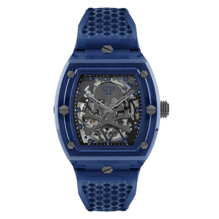 Die Philipp Plein® Analoge 'The $keleton Crystal' Herrenarmbanduhr PWPTA0324 ist ein Zeitmesser, der mutiges Design und überlegene Handwerkskunst perfekt miteinander vereint. Diese Uhr erzählt nicht nur die Zeit, sondern setzt auch ein kraftvolles Statement. Das Design umfasst ein auffälliges Gehäuse aus blauem Harz mit einer Länge von 44 mm und einer Breite von 42 mm, das für eine robuste Präsenz am Handgelenk sorgt. Der tonneau-förmige Stil des Gehäuses wird durch eine Dicke von 14 mm und ein fesselndes schwarzes Zifferblatt betont, das durch strapazierfähiges Mineralglas geschützt ist. Diese Kombination sorgt dafür, dass Sie nicht nur gut aussehen, sondern auch eine zuverlässige Uhr besitzen, die Ihren Stil unterstreicht. Der Antrieb dieser Uhr erfolgt durch ein genaues Quarzwerk, das eine präzise Zeitmessung gewährleistet. Das blaue Kunststoffarmband ist auf Komfort ausgelegt, hat eine Länge von 21 cm und eine Breite von 26 mm und eignet sich somit für jedes Handgelenk. Es verfügt über eine robuste Schnalle, die Sicherheit bei jeder Aktivität garantiert. Mit einer Wasserbeständigkeit von 5 ATM ist diese Uhr ideal für den modernen Mann mit einem aktiven Lebensstil. Egal, ob Sie in einem Meeting sind oder einen Abend in der Stadt genießen, dieses Zeitmessgerät ist darauf ausgelegt, den Herausforderungen des Alltags zu trotzen und dabei mühelos luxuriös auszusehen. The $keleton Crystal ist nicht nur eine Uhr; sie ist ein Ausdruck von Individualität und Selbstbewusstsein und zieht überall dort, wo Sie hingehen, die Blicke auf sich.Shop Philipp Plein® Analogue 'The $keleton Crystal' Herrenarmbanduhr PWPTA0324 bei Ormoda
