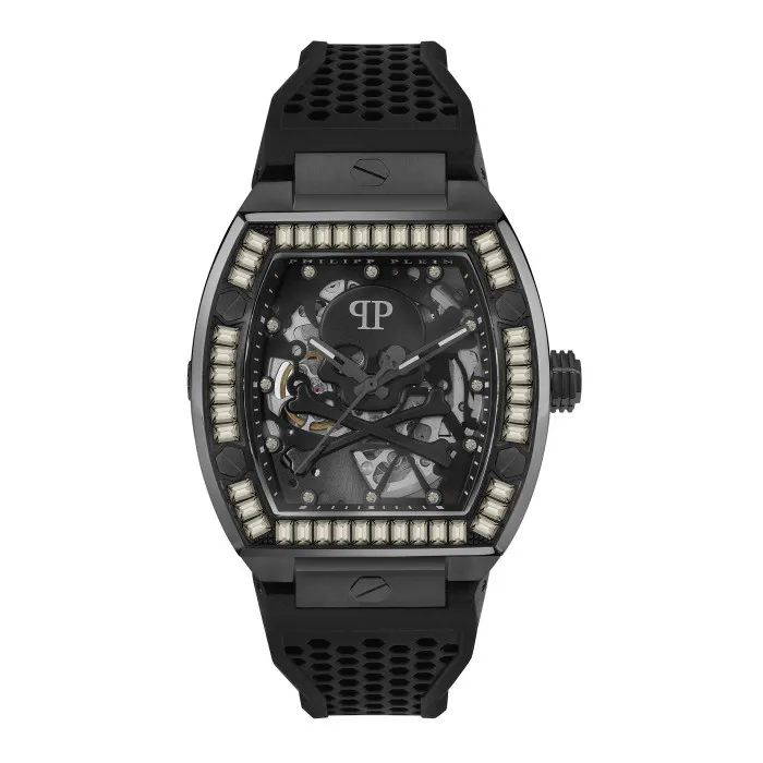 Der Philipp Plein® Analogue 'The $keleton' Herrenchronograph PWBAA1923 ist eine perfekte Verbindung von Raffinesse und Stil. Dieses auffällige Zeitmesser wurde kunstvoll für den modernen Mann entworfen, der Luxus schätzt und ein Statement setzen möchte. Die Uhr verfügt über ein automatisches Uhrwerk, das Präzision und Zuverlässigkeit gewährleistet und gleichzeitig Selbstbewusstsein mit jedem Ticken ausstrahlt. Das Gehäuse strahlt in einem kräftigen Schwarz, gefertigt aus hochwertigem Edelstahl, und ist in einer tonneauförmigen Gestalt designt, die sowohl Einzigartigkeit als auch Komfort am Handgelenk bietet. Mit einem Durchmesser von 44 mm und einer Dicke von 14 mm ist es sowohl substanziell als auch elegant und macht es zu einem vielseitigen Accessoire, das sich sowohl für lässige Ausflüge als auch für formelle Anlässe eignet. Das fesselnde schwarze Zifferblatt ist gut geschützt durch Mineralglas, was einen eleganten Hintergrund für das filigrane Design dieser Uhr bietet. Das Zifferblatt verfügt über Steineinfassungen, die das Licht auffangen und einen Hauch von Luxus zu seiner robusten Ästhetik hinzufügen. Gleichzeitig ist das Silikonarmband nicht nur strapazierfähig, sondern auch komfortabel, mit einer Länge von 21 cm und einer Breite von 28 mm. Es ist mit einem stilvollen Steckverschluss ausgestattet, der einen sicheren Sitz am Handgelenk gewährleistet. Die Uhr ist bis zu 5 Bar wasserdicht, was sie zu einer praktischen Wahl für den täglichen Einsatz macht, ohne dabei an Stil zu verlieren. Dieses Zeitmesser ist mehr als nur eine Uhr; es ist ein Statement für Kraft und Raffinesse, perfekt für den Mann, der selbstbewusst durch das Leben schreitet. Shop Philipp Plein® Analogue 'The $keleton' Herrenchronograph bei Ormoda