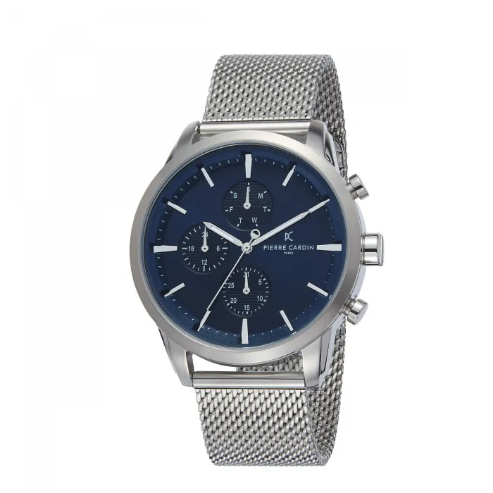 Die Pierre Cardin® Multi Dial 'La Gloire Champeret' Herren Uhr PC902741F105 ist eine auffällige Kombination aus Eleganz und Funktionalität. Diese Uhr, die für den modernen Mann entworfen wurde, verkörpert einen lässigen Stil, der mühelos sowohl formelle als auch entspannte Outfits ergänzt. Das runde Gehäuse aus robustem Edelstahl präsentiert sich in einem eleganten Silber-Mfinish, der seinen zeitgenössischen Charme unterstreicht. Mit einem Gehäusedurchmesser von 45 mm und einer Dicke von 11 mm vermittelt sie eine eindrucksvolle Präsenz am Handgelenk und sorgt gleichzeitig für Komfort und Tragbarkeit. Das tiefblaue Zifferblatt ist nicht nur visuell beeindruckend, sondern auch praktisch und bietet eine Multifunktionsanzeige, mit der Sie die Uhrzeit in verschiedenen Zonen mühelos im Blick behalten können. Der Uhrwerk wird von einem zuverlässigen Quarzmechanismus angetrieben, der für Präzision und Zuverlässigkeit sorgt. Das Mineralglas schützt das filigrane Zifferblatt, das seine ausgeklügelten Details zur Schau stellt und gleichzeitig ausreichende Haltbarkeit bietet. Darüber hinaus ist die Uhr mit einer praktischen Datums- und Wochentagsanzeige ausgestattet, die sie zu einem perfekten Begleiter für Ihre täglichen Abenteuer macht. Das Armband aus Edelstahl, das eine Länge von 21 cm und eine Breite von 22 mm aufweist, verfügt über eine sichere Klappschließe, die sowohl Komfort als auch Sicherheit garantiert. Mit einer Wasserbeständigkeit von 3 bar ist diese Uhr in der Lage, Spritzern und kurzen Eintauchungen standzuhalten und erhöht damit ihre vielseitige Nutzung. Mit einem Gewicht von nur 115 Gramm wurde die Pierre Cardin Multi Dial Uhr für diejenigen entworfen, die Stil schätzen, ohne auf Praktikabilität zu verzichten. Setzen Sie mit diesem bemerkenswerten Stück, das sowohl Eleganz als auch Funktionalität verkörpert, neue Akzente in Ihrer Accessoire-Sammlung. Shop Pierre Cardin® Multi Dial 'La Gloire Champeret' Herren Uhr bei Ormoda