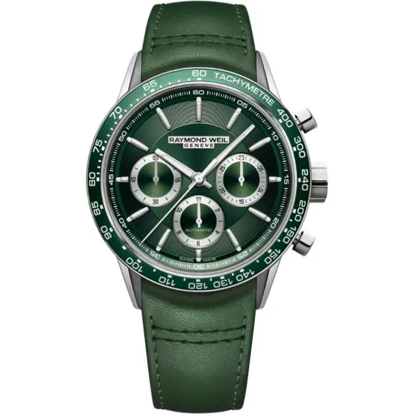 Die Raymond Weil® Chronograph 'Freelancer' Herrenuhr 7741-SC7-52021 verkörpert die Verschmelzung von Kunstfertigkeit und Präzision, ein Zeugnis des angesehenen Handwerks, das mit der Marke Raymond Weil verbunden ist. Dieses bemerkenswerte Zeitwerk, entworfen für den modernen Mann, besticht durch ein kühnes und fesselndes grünes Zifferblatt, das Anmut ausstrahlt. Das automatische Uhrwerk sorgt für eine zuverlässige Leistung und ist mit einem Gehäuse aus Edelstahl ausgestattet, das fachmännisch einen Durchmesser von 43,5 mm und eine Dicke von 14 mm misst. Der runde Gehäusestil unterstreicht seinen klassischen Reiz, während das lebhafte grüne Armband aus hochwertigem Leder einen zusätzlichen Hauch von Eleganz verleiht. Mit einer Bandlänge von 21 cm und einer Anstoßhöhe von 51 mm bietet es einen komfortablen Sitz für den täglichen Gebrauch. Diese Uhr verfügt über eine Schließe, die eine Deployment-Schließe ist und dafür sorgt, dass sie sicher am Handgelenk bleibt. Für Vielseitigkeit ist der 'Freelancer' mit einer Tachymeterlünette ausgestattet, die es ermöglicht, Geschwindigkeit basierend auf Zeit und Distanz zu messen. Darüber hinaus ist sie mit einem Chronographen-Display ausgestattet, das leuchtende Zeiger für die Ablesbarkeit bei schlechten Lichtverhältnissen bietet. Mit einer beeindruckenden Wasserdichtigkeit von bis zu 10 Bar ist dieses Zeitwerk nicht nur schön; es kann den Herausforderungen des täglichen Lebens standhalten und behält dennoch sein makelloses Erscheinungsbild. Das Saphirglas-Zifferblatt sorgt für Kratzfestigkeit und bestätigt, dass diese Uhr darauf ausgelegt ist, die Zeit zu überdauern.Shop Raymond Weil® Chronograph 'Freelancer' Herrenuhr 7741-SC7-52021 bei Ormoda