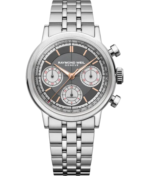 Raymond Weil ist ein namhafter Schweizer Uhrenhersteller, der für sein Engagement für traditionelle Handwerkskunst und innovative Designs bekannt ist. Seit seiner Gründung im Jahr 1976 hat die Marke kontinuierlich Zeitmesser geschaffen, die Eleganz mit Funktionalität verbinden und sich an diejenigen richten, die die feinen Dinge im Leben schätzen. Mit einer reichen Geschichte, die vom Geist der Musik und Kunst geprägt ist, spiegeln die Uhren von Raymond Weil eine Leidenschaft für Präzision wider und haben ein tiefes Verständnis für die Nuancen entwickelt, die eine Uhr von einem bloßen Accessoire zu einem Erbe erheben. Jedes Stück ist ein Zeugnis der Exzellenz der Schweizer Uhrenmacherei, sorgfältig gefertigt und mit fortschrittlicher Technologie ausgestattet, was sie zu einem geschätzten Namen unter Uhrenliebhabern macht. Die Marke floriert weiterhin auf dem globalen Markt, indem sie an der Spitze der Uhreninnovation bleibt und gleichzeitig ihrer Tradition der Qualität treu bleibt. Jede Uhr von Raymond Weil erzählt eine Geschichte von Eleganz, Raffinesse und zeitloser Anziehungskraft, entworfen für diejenigen, die es wagen, mit Selbstbewusstsein aufzufallen.Entdecken Sie Raymond Weil® Chronograph 'Millesime' Herrenuhr