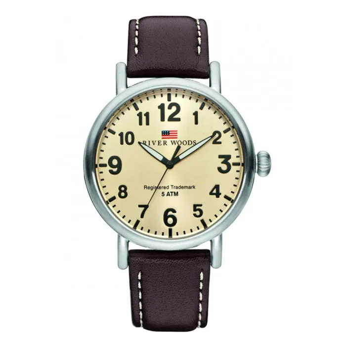 Die River Woods® Analogue 'Sacramento' Herrenuhr RW420019 verkörpert Eleganz und zeitlose Raffinesse. Mit einem 42 mm großen Gehäuse aus silbernem Edelstahl ist diese Uhr darauf ausgelegt, einen bleibenden Eindruck zu hinterlassen. Der runde Gehäusestil, kombiniert mit einer schlanken Dicke von nur 9 mm, bietet ein elegantes Profil, das mühelos unter Hemden getragen werden kann oder gut zu lässigen Outfits passt. Das Zifferblatt in einem einladenden Beigeton schafft einen warmen Kontrast zum silbernen Gehäuse und sorgt dafür, dass die Lesbarkeit dank des haltbaren Mineralglasfensters, das es schützt, jederzeit gegeben ist. Angetrieben von einem zuverlässigen Quarzwerk garantiert diese Uhr präzises Zeitmanagement, auf das Sie Tag für Tag zählen können. Das braune Lederarmband ergänzt die Uhr auf elegante Weise und hat eine verstellbare Länge von 21 cm bei einer komfortablen Breite von 19 mm. Mit einer Schnallenverschluss ist es einfach zu sichern und zu entfernen, während es gleichzeitig einen festen Sitz am Handgelenk gewährleistet. Diese Uhr, die für den täglichen Gebrauch konzipiert ist, ist bis zu 5 Bar wasserdicht, was Ihnen beruhigendes Vertrauen gibt, egal ob Sie im Büro sind, auf einer Geschäftsreise oder einen entspannten Ausflug genießen. Die Höhe von 50 mm von Anschlag zu Anschlag sorgt für ein ausgewogenes Erscheinungsbild am Handgelenk und macht die Sacramento zu einer vielseitigen Ergänzung für jede Männersammlung. Diese Uhr spiegelt nicht nur Ihren persönlichen Stil wider, sondern ist auch ein zuverlässiger Begleiter in Ihrem Alltag. Shop River Woods® Analogue 'Sacramento' Herrenuhr bei Ormoda