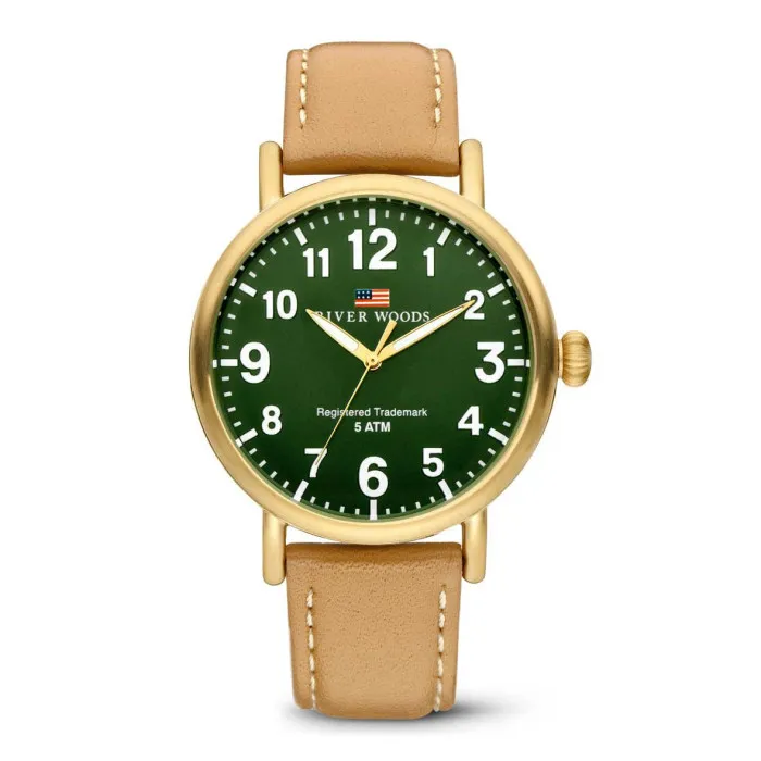 Präsentiert wird die River Woods® Analogue 'Sacramento' Herrenarmbanduhr RW420022, ein Meisterwerk, das sowohl für lässige Freizeit als auch für formelle Anlässe geeignet ist. Dieses elegante Zeitmesser verbindet auf fabelhafte Weise Robustheit und Stil und ist der ideale Begleiter für den modernen Mann. River Woods steht für Qualitätsverpflichtung und bietet ausgezeichnete Handwerkskunst in jeder Uhr, die sie kreieren. Das Modell Sacramento besteht aus Edelstahl, was für Langlebigkeit sorgt, während das atemberaubende grüne Zifferblatt einen Hauch von Raffinesse verleiht. Mit einem runden Gehäuse-Design und einem Durchmesser von 42 mm setzt diese Uhr ein Statement, ohne aufdringlich zu sein. Das goldene Gehäuse ergänzt sich perfekt mit dem braunen Lederband und hebt damit deinen scharfen Stil hervor. Die Dicke von 9 mm gewährleistet einen angenehmen Tragekomfort, sodass du die Uhr den ganzen Tag über bequem tragen kannst. Das Quarzwerk sorgt für eine präzise Zeitmessung, sodass du dich auf das Wesentliche konzentrieren kannst. Mit einer Wasserdichtigkeit von bis zu 5 ATM ist die Sacramento für alltägliche Spritzer gewappnet und somit die perfekte Uhr für den aktiven Mann. Der praktische Schnallenverschluss sorgt dafür, dass die Uhr sicher am Handgelenk bleibt und gleichzeitig bequem sitzt. Mit einem Gesamtgewicht von 55 Gramm ist sie leicht genug, um nicht klobig zu wirken, jedoch ausreichend, um Zuverlässigkeit auszustrahlen. Das Band hat eine Breite von 19 mm und bietet somit das perfekte Gleichgewicht zwischen Eleganz und Tragekomfort, mit einer Länge von 21 cm, die sich angenehm an die meisten Handgelenke anpasst. Im Grunde genommen ist die River Woods Analogue 'Sacramento' mehr als nur eine Uhr; sie ist ein Ausdruck von Stil und Vertrauenswürdigkeit, der viel über deinen Geschmack aussagt. Shop River Woods® Analogue 'Sacramento' Herrenarmbanduhr bei Ormoda