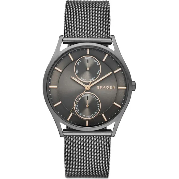 Die Skagen® Multi Dial 'Holst' Herrenuhr SKW6180 ist eine perfekte Verschmelzung von Stil und Funktionalität und verkörpert das Wesen des skandinavischen Designs. Dieses Zeitmesser verfügt über ein rundes Gehäuse aus rostfreiem Stahl, das in einem auffälligen Grauton gehalten ist. Mit einem Durchmesser von 40 mm und einer schlanken Dicke von nur 9 mm vereint sie mühelos Komfort und Präsenz am Handgelenk. Das innovative Multidiagramm-Display bietet mehr als nur die Zeitangabe und zeigt einen Kalender mit Datum und Tag für zusätzlichen Komfort. Geschützt durch Mineralglas ist das Zifferblatt sowohl ansprechend als auch langlebig und weist eine harmonische Mischung aus Grautönen auf, die schlichte Eleganz widerspiegelt. Das Armband, ebenfalls aus rostfreiem Stahl gefertigt, zeigt eine elegante graue Farbe, die das Gehäuse schön ergänzt. Mit einer Länge von 21 cm und einer Breite von 22 mm gewährleistet es einen sicheren und bequemen Sitz für den täglichen Gebrauch. Das Klappverschluss-Design verleiht der Uhr einen zusätzlichen Hauch von Raffinesse und bietet gleichzeitig praktische Handhabung. Mit einer Wasserdichtigkeit von 5 ATM ist diese Uhr robust genug für verschiedene Aktivitäten und damit ein vielseitiger Begleiter für sowohl legere als auch semi-formale Anlässe. Mit einem Gewicht von nur 73 Gramm bietet die Skagen® Multi Dial 'Holst' das perfekte Gleichgewicht zwischen leichtem Tragekomfort und robuster Verarbeitung. Dies ist nicht nur eine Uhr zur Zeitmessung, sondern auch ein Statement, das alltägliche Nützlichkeit mit zeitlosem Stil verbindet. Egal, ob Sie ins Büro gehen oder einen Abend außer Haus verbringen, diese Uhr wurde entwickelt, um Ihren Look mit Selbstbewusstsein zu vervollständigen.Shop Skagen® Multi Dial 'Holst' Herrenuhr SKW6180 bei Ormoda