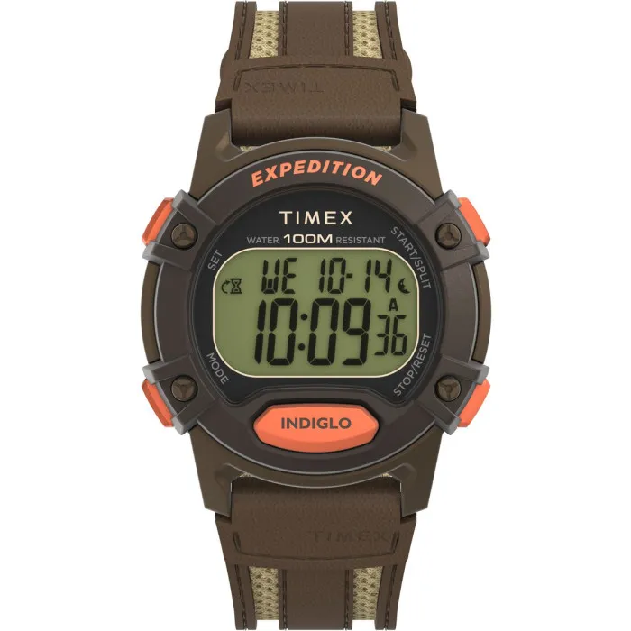 Die Timex® Digital 'Expedition Cat 5' Herren Uhr TW4B30400 verkörpert eine perfekte Kombination aus Innovation und robustem Stil. Diese Uhr ist speziell für Abenteuerlustige konzipiert und kombiniert Langlebigkeit mit praktischen Funktionen, die auf aktive Lebensstile zugeschnitten sind. Die Expedition Cat 5 ist ein Synonym für Zuverlässigkeit und ein Beweis für Timex' Engagement, hochwertige Zeitmesser zu produzieren. Seit Jahrzehnten bleibt Timex ein vertrauenswürdiger Uhrenhersteller, der kontinuierlich in der Lage ist, die Bedürfnisse seiner Kunden zu erfüllen. Mit Wurzeln, die tief im Outdoor-Erlebnis verwurzelt sind, werden Timex-Uhren so konstruiert, dass sie den Elementen standhalten und gleichzeitig präzise Zeitmessung in jeder Situation bieten. Die Timex® Digital 'Expedition Cat 5' Herren Uhr TW4B30400 verfügt über ein robustes Gehäuse aus braunem Harz mit einem Durchmesser von 40mm und einer Dicke von 10mm, was sicherstellt, dass sie sowohl urbanen Abenteuern als auch rauen Geländen standhält. Das LCD-Zifferblatt, geschützt durch Mineralglas, bietet eine klare Zeitanzeige mit Tages- und Datumsoptionen für mühelosen Zugriff auf tägliche Informationen. Für diejenigen, die Wert auf Funktionalität legen, enthält diese Uhr eine Stoppuhr, einen Countdown-Timer und einen Alarm, was sie perfekt für die Zeitmessung Ihrer Aktivitäten oder die Organisation Ihres Tages macht. Die Uhr ist für Komfort ausgelegt, mit einem braunen Stoffband, das eine Länge von 21cm hat und perfekt zu ihrem robusten Erscheinungsbild passt. Sie verfügt über einen sicheren Schnallenverschluss für praktische Tragekomfort. Die Uhr ist zudem mit 10 ATM bewertet, das heißt, Sie können schwimmen und sich ohne Bedenken an Wasseraktivitäten beteiligen. Ob auf den Wanderwegen oder bei der Planung Ihres Terminkalenders, die Timex® Digital 'Expedition Cat 5' Herren Uhr TW4B30400 verbindet Stil, Funktionalität und Haltbarkeit zu einem unverzichtbaren Accessoire für den modernen Mann, der sowohl Abenteuer als auch das tägliche Leben umarmt. Shop Timex® Digital 'Expedition Cat 5' Herren Uhr bei Ormoda