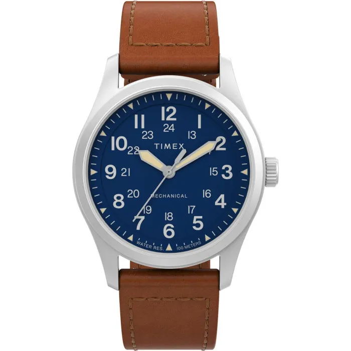 Die Timex® Analogue 'Expedition North Field Post' Herrenuhr TW2V00700 ist ein Beweis für die robuste Eleganz und Zuverlässigkeit, für die Timex steht. Diese Uhr ist für den Mann gedacht, der das Abenteuer schätzt und gleichermaßen Wert auf Stil und Haltbarkeit legt. Der militärisch inspirierte Look und das funktionale Design machen sie zur idealen Wahl, egal ob Sie durch Städte streifen oder die Wildnis erkunden. Gefertigt aus hochwertigem Edelstahl, strahlt das Gehäuse sowohl Stärke als auch Männlichkeit aus, während die auffällige silberne Farbe einen Hauch von Raffinesse hinzufügt. Das runde Gehäuse hat eine Dicke von 11 mm und einen Durchmesser von 38 mm, was es zur perfekten Größe für einen vielseitigen Tragekomfort macht. Es ist mit einem Saphirglas-Dial-Fenster ausgestattet, das Klarheit und Kratzfestigkeit garantiert und somit ideal für jede Umgebung ist. Was diese Uhr besonders macht, ist das tiefe blaue Zifferblatt, das einen einzigartigen Farbk contrast zum silbernen Gehäuse bietet. Die analoge Anzeige ist nicht nur visuell ansprechend, sondern auch funktional, was eine einfache Ablesbarkeit ermöglicht. Ergänzt durch ein braunes Lederarmband mit einer Länge von 21 cm und einer Breite von 19 mm, vereint diese Uhr Komfort mit robuster Funktionalität, gesichert durch einen starken Schnallenverschluss. Mit einer beeindruckenden Wasserdichtigkeit von 10 bar ist diese Uhr in der Lage, Spritzern und sogar Unterwasserbedingungen standzuhalten und macht sie zu einem zuverlässigen Begleiter bei jedem Ausflug. Mit einem Gewicht von nur 67 Gramm liegt sie leicht am Handgelenk und beweist, dass Funktionalität und Komfort tatsächlich koexistieren können. Die Timex® Analogue 'Expedition North Field Post' ist nicht nur eine Uhr; sie verkörpert Abenteuer, Zuverlässigkeit und zeitlosen Stil.Shop Timex® Analogue 'Expedition North Field Post' Herrenuhr bei Ormoda