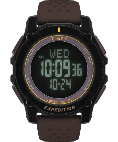 Die Timex® Digital 'Expedition North Ridge' Herren Uhr TW4B33800 verkörpert Haltbarkeit und Funktionalität, konzipiert für den modernen Mann, der die Wildnis erobert. Dieses Zeitmesser verbindet auf einzigartige Weise robuste Ästhetik mit unverzichtbarer Technologie und ist der perfekte Begleiter für jedes Abenteuer. Mit einem stabilen schwarzem Gehäuse aus Harz misst sie im Durchmesser 49 mm und hat eine Dicke von 12 mm, was sicherstellt, dass sie den Elementen standhält und dabei auf Ihrem Handgelenk eine starke Präsenz zeigt. Das schwarze Zifferblatt wird von einem Mineralglas geschützt, das kratzfest ist und bei verschiedenen Lichtverhältnissen Klarheit bietet. Die Uhr verfügt über ein beeindruckendes Funktionsspektrum, das alle von einem zuverlässigen Quarzwerk betrieben wird. Sie ist solarbetrieben und somit eine umweltfreundliche Wahl für diejenigen, die Wert auf Nachhaltigkeit legen. Mit einer Vielzahl von Funktionen, darunter Stoppuhr, Countdown-Timer, Weltzeit und mehrere Alarme, bietet die Timex® Digital 'Expedition North Ridge' Vielseitigkeit für einen aktiven Lebensstil. Ihr braunes Silikonarmband passt sich bequem an Handgelenke bis zu 21 cm an und gewährleistet Tragekomfort ohne Kompromisse beim Stil. Die Schnallenverschluss sorgt für einen sicheren Sitz, ob beim Wandern in den Bergen oder beim Navigieren durch Ihren Alltag. Mit einer wasserdichten Bewertung von 10 bar kann diese Uhr Spritzern und kurzen Eintauchungen standhalten, was sie nicht nur zu einem Zeitmesser, sondern zu einem zuverlässigen Partner für alle Aktivitäten macht. Leben Sie den Geist der Erkundung mit der Timex® Digital 'Expedition North Ridge', einer perfekten Mischung aus Funktionalität und robustem Charme.Shop Timex® Digital 'Expedition North Ridge' Herren Uhr bei Ormoda