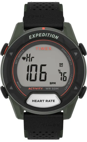Die Timex® Digital 'Expedition Trailblazer' Herrenuhr TW4B27000 verkörpert robuste Eleganz und spricht den abenteuerlustigen Geist an. Diese Uhr wurde für diejenigen entwickelt, die sowohl Funktionalität als auch Stil schätzen. Sie verfügt über ein auffälliges grünes Gehäuse aus Resin, das den Elementen standhält und einen beeindruckenden Durchmesser von 42 mm sowie eine Dicke von 13 mm aufweist. Ihr Design spiegelt eine militärisch inspirierte Ästhetik wider und macht sie zu einem idealen Accessoire für Outdoor-Enthusiasten und städtische Entdecker gleichermaßen. Das LCD-Ziffernblatt ist durch langlebiges Mineralglas geschützt, was die Sichtbarkeit unter verschiedenen Lichtverhältnissen gewährleistet, insbesondere beim Einsatz des Indiglo-Lichts für nächtliche Abenteuer. Eine Vielzahl von Funktionen hebt diese Uhr hervor, darunter ein zuverlässiges Quarzwerk, das für genaue Zeitmessung sorgt. Sie ist mit einem Countdown-Timer, einem Alarm und einem Herzfrequenzmesser ausgestattet, perfekt für Fitnessbegeisterte, die ihre Leistung überwachen. Der Tages- und Datumsanzeiger bietet eine zusätzliche Ebene von Bequemlichkeit und hilft Ihnen, sowohl die Uhrzeit als auch das Datum mühelos im Blick zu behalten. Das grüne Stoffarmband ergänzt nicht nur den militärischen Look der Uhr, sondern bietet auch Komfort mit einer Länge von 21 cm und einer Breite von 19 mm, sodass es optimal an jedem Handgelenk sitzt. Der Schnallenverschluss ermöglicht einfache Anpassungen, was das Tragen während jeder Aktivität mühelos macht. Mit einer Wasserfestigkeit von bis zu 3 bar kann die Uhr Spritzern standhalten und ist somit für den täglichen Gebrauch geeignet. Diese Uhr vereint nahtlos Praktikabilität mit Stil und ist ein unverzichtbarer Begleiter für einen Mann, der stets auf den Beinen ist. Shop Timex® Digital 'Expedition Trailblazer' Herrenuhr bei Ormoda