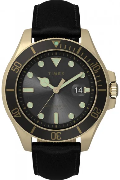 Präsentation der Timex® Analogue 'Harborside Coast' Herrenuhr TW2V42200, ein faszinierendes Stück, das Stärke, Handwerkskunst und Funktionalität verkörpert. Diese Taucheruhr kombiniert Praktikabilität mit einer markanten Ästhetik. Das runde Gehäuse aus Messing, beschichtet mit einem eleganten Gold-Finish, zeigt eine Vielzahl von Funktionen, wodurch es ideal für Abenteuerlustige sowie für diejenigen ist, die in ihrem Alltagslook einen Hauch von Eleganz suchen. Mit einem Durchmesser von 44 mm und einer Dicke von 11 mm bietet sie das perfekte Gleichgewicht zwischen Präsenz und Tragekomfort. Das schwarze Zifferblatt wird durch ein robustes Mineralglas geschützt, das gewährleistet, dass es den kleinen Missgeschicken des Lebens standhält und gleichzeitig eine klare Sicht auf die Uhrzeit bietet. Die drehbare Lünette fügt ein interaktives Element hinzu, ideal, um Ihre Unterwasserabenteuer zu timing. Diese Uhr ist nicht nur ein Zeitmesser; sie ist ein durchdachter Begleiter für den Mann, der sowohl Form als auch Funktion schätzt. Mit einer Wasserdichtigkeit von bis zu 10 Bars können Sie die 'Harborside Coast' bedenkenlos beim Tauchen oder Schwimmen tragen. Die Uhr wird mit einem stabilen schwarzen Lederarmband geliefert, das 21 cm lang und 19 mm breit ist. Dieses Armband ergänzt elegant das auffällige Zifferblatt und wird mit einem klassischen Schnallenverschluss gesichert. Die Datumsfunktion erhöht die Praktikabilität Ihrer Abenteuer und sorgt dafür, dass Sie nie den Überblick über Ihren vollen Terminkalender verlieren. Mit einem Gewicht von nur 70 Gramm ist sie leicht genug, um angenehm zu tragen, egal ob im Büro oder beim Erforschen der Tiefen. Die 'Harborside Coast' ist wahrlich ein Ausdruck von Timex' Hingabe an Innovation und Exzellenz, bereit, jeden Ihrer Momente zu bereichern. Shop Timex® Analogue 'Harborside Coast' Herrenuhr bei Ormoda