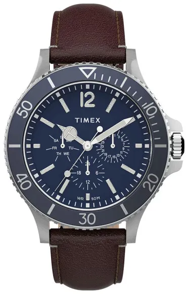 Stellen Sie die Timex® Multi Dial 'Harborside' Herren Uhr TW2U13000 vor, eine perfekte Kombination aus Stil und Funktionalität für den anspruchsvollen Herren. Diese Uhr ist so gestaltet, dass sie den Anforderungen der lässigen Eleganz gerecht wird. Sie verfügt über ein robustes Gehäuse aus Edelstahl mit einem Durchmesser von 43mm und einer Dicke von 12mm. Ihr rundes Design wird durch eine polierte silberne Gehäusefarbe ergänzt, die Selbstbewusstsein und Raffinesse ausstrahlt. Das auffällige blaue Zifferblatt ist durch hochwertiges Mineralglas geschützt und sorgt für Klarheit und Langlebigkeit in allen Lebenslagen. Diese multifunktionale Uhr bietet eine drehbare Lünette, mit der Sie die Zeit mühelos im Blick behalten können. Außerdem verfügt sie über ein praktisches Kalenderfenster für Tag und Datum, um Sie organisiert zu halten. Angetrieben von präzisem Quarzwerk wird Pünktlichkeit nie ein Problem sein. Das braune Lederband fügt eine Note von Wärme und Raffinesse hinzu und misst 21cm in der Länge und 19mm in der Breite, ausgestattet mit einem sicheren Schnallenverschluss für Ihr Beruhigung. Mit einer Wasserbeständigkeit von bis zu 5 Bar ist diese Uhr bereit für jedes Abenteuer und wird zu Ihrem zuverlässigen Begleiter sowohl im Wasser als auch an Land. Mit einem Gewicht von nur 76 Gramm bietet sie die perfekte Balance zwischen Gewicht und Tragekomfort. Die Timex® Harborside ist für Männer konzipiert, die Präzision, Stil und die Freiheit des Entdeckens schätzen und strahlt eine professionelle und freundliche Aura aus, die jeder Träger zu schätzen weiß.