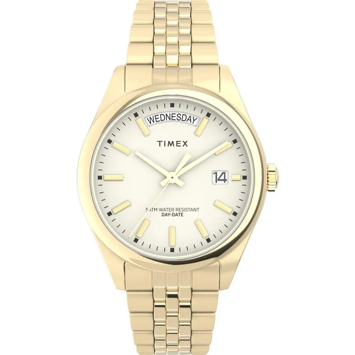 Erleben Sie die zeitlose Eleganz der Timex® Analogue 'Legacy' Damenarmbanduhr TW2V68300. Dieses exquisite Zeitmesser ist perfekt für die moderne Frau, die klassischen Stil mit zeitgenössischer Funktionalität schätzt. Für festliche Anlässe entworfen, passt das runde Gehäuse aus rostfreiem Stahl in strahlendem Gold perfekt zu jedem formellen Outfit. Mit einem komfortablen Durchmesser von 36 mm liegt es anmutig am Handgelenk, während die Dicke von 10 mm einen subtilen Auftritt verleiht, ohne Ihre feminine Ausstrahlung zu überwältigen. Das Zifferblatt in einem beeindruckenden Champagnerfarbe wird durch haltbares Mineralglas geschützt, das Klarheit und Widerstandsfähigkeit gewährleistet. Die eleganten Zeiger und Indizes ermöglichen eine einfache Ablesbarkeit, während das Tages- und Datumsfenster Praktikabilität in das anspruchsvolle Design integriert. Der Klappverschluss mit Druckknopf bietet Sicherheit und Tragekomfort, sodass dieses Stück nicht nur glamourös aussieht, sondern auch im Alltag nahtlos funktioniert. Das wunderschöne Armband aus goldfarbenem Edelstahl, das eine Länge von 19 cm und eine Breite von 17 mm hat, ergänzt das Gehäuse perfekt und verleiht einen luxuriösen Touch. Mit einer Wasserdichtigkeit von bis zu 5 Bar können Sie diese Uhr sorglos tragen, ohne sich Gedanken über Schäden bei Ihren täglichen Aktivitäten machen zu müssen. Mit einem Gewicht von nur 84 g bietet sie den Komfort, den Sie den ganzen Tag lang ohne Schwierigkeiten genießen können. Die Timex® Analogue 'Legacy' Damenarmbanduhr ist nicht nur ein Zeitmesser; sie ist ein Statement-Stück, das Eleganz und Raffinesse in jedem Ticken verkörpert. Shop Timex® Analogue 'Legacy' Damenarmbanduhr bei Ormoda