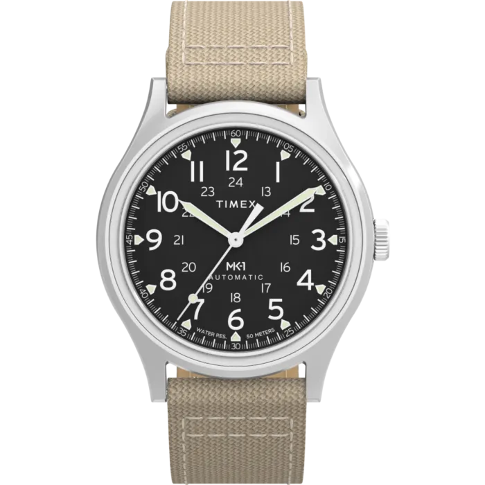 Entdecken Sie die Essenz des Abenteuers mit der Timex® Analogue 'Military Mk1' Herren Uhr TW2Y11900. Dieses robuste Zeitmesser verkörpert einen Geist von Widerstandsfähigkeit und Einfachheit, designed, um den Anforderungen des Lebens standzuhalten, während er einen klassischen Stil bewahrt, der den modernen Mann anspricht. Präzise verarbeitet, zeigt diese Uhr ein robustes Gehäuse aus Edelstahl, das Langlebigkeit ausstrahlt. Das silberne Gehäuse misst 40 mm im Durchmesser und 13,5 mm in der Dicke und bietet ein elegantes rundes Design, das perfekt zu seinem schwarzen Zifferblatt passt und Klarheit sowie Eleganz auf einen Blick bietet. Mineralglas schützt das Zifferblatt, gewährleistet Langlebigkeit und Widerstandsfähigkeit gegen Abnutzung. Der automatische Uhrwerk sorgt für präzise Zeitmessung und verkörpert die Zuverlässigkeit, für die Timex bekannt ist. Das bequeme, beige Stoffband verleiht einen Hauch von Komfort und Vielseitigkeit, verstellbar für Handgelenke bis zu 21 cm, gesichert durch einen zuverlässigen Druckverschluss für einfache Handhabung. Mit einer beeindruckenden Wasserbeständigkeit von bis zu 5 bar ist diese Uhr bereit für jedes aquatische Abenteuer oder städtische Ausflüge. Die Timex® Military Mk1 erfüllt nicht nur einen funktionalen Zweck, sondern setzt auch ein Statement – eine perfekte Mischung aus Robustheit und Raffinesse für Männer, die hochwertige Zeitmesser schätzen. Shop Timex® Analogue 'Military Mk1' Herren Uhr bei Ormoda