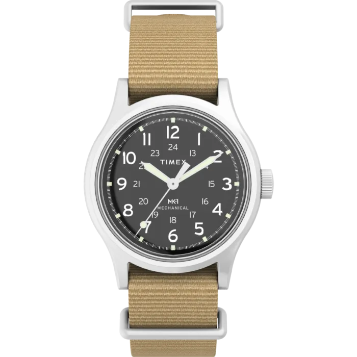 Die Timex® Analogue 'Military Mk1' Herrenuhr TW2Y12000 ist ein Zeugnis für zeitloses Design und Funktionalität. Mit einem 36 mm großen Gehäuse aus silbernem Edelstahl verkörpert diese Uhr einen robusten und gleichzeitig eleganten Geist, perfekt für den modernen Mann. Das runde Gehäuse hat eine Dicke von nur 10,5 mm und bietet ein schlankes Profil, das angenehm am Handgelenk sitzt und dennoch eine markante Präsenz hat. Im Herzen der Uhr befindet sich ein agiles mechanisches Uhrwerk, das Präzision und Zuverlässigkeit für all Ihre täglichen Abenteuer gewährleistet. Das markante schwarze Zifferblatt verfügt über gut lesbare Stundenmarkierungen, die die Sichtbarkeit auch bei schwachem Licht verbessern. Geschützt durch das strapazierfähige Mineralglas hält das Zifferblatt den Anforderungen des täglichen Gebrauchs stand und ermöglicht es Ihnen, Ihren stilvollen Look ohne Kompromisse aufrechtzuerhalten. Das beige Stoffband ergänzt nicht nur das silberne Gehäuse, sondern bietet auch einen bequemen Sitz, der sich über die Zeit bewährt. Mit einer Bandlänge von 21 cm und einer Breite von 17 mm kann es an Ihre Bedürfnisse angepasst werden. Mit einer Wasserbeständigkeit von bis zu 5 bar ist die Military Mk1 ideal für aktive Lebensstile, ganz ohne die Mühe, die Uhr abzunehmen. Mit einem Gewicht von nur 47 Gramm ist sie leicht, aber robust genug für jede Gelegenheit. Diese Uhr ist eine perfekte Mischung aus Form und Funktion und somit eine ausgezeichnete Wahl für sowohl legere Ausflüge als auch formellere Anlässe. Shop Timex® Analogue 'Military Mk1' Herrenuhr bei Ormoda