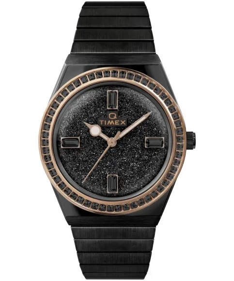 Schreiten Sie in zeitlose Eleganz mit der Timex® Analogue 'Q Reissue' Damenarmbanduhr TW2W10600. Dieses bemerkenswerte Zeitmessgerät vereint den klassischen Stil einer Dressuhr mit moderner Funktionalität und ist somit das ideale Accessoire für jede Gelegenheit. Mit einem 36 mm runden Gehäuse aus strapazierfähigem Edelstahl zeigt diese Uhr ein elegantes schwarzes Finish, das mit Charme und Anmut harmoniert. Das minimalistische schwarze Zifferblatt wird durch ein widerstandsfähiges Mineralglas geschützt, das seine Schönheit bewahrt und die Ablesbarkeit auf einen Blick gewährleistet. Die aufwendigen Steinbesetzungen auf der Lünette verleihen einen Hauch von Luxus, der sowohl Blicke als auch Komplimente auf sich ziehen wird. Das Quarzwerk sorgt für eine präzise Zeitmessung, während das 12 mm dicke Gehäuse eine selbstbewusste Präsenz am Handgelenk bietet. Der sich dehnende Armbandverschluss sorgt für einen sicheren Sitz, während die Länge von 19 cm und die Breite von 20 mm ein angenehmes Tragegefühl für den Alltag bieten. Ob Sie sich für ein formelles Event kleiden oder Ihrem Alltagslook Eleganz verleihen möchten, diese Uhr wird Ihr Ensemble mit ihrem schlanken und modernen Ästhetik aufwerten. Die Wasserbeständigkeit von bis zu 5 Bar ermöglicht es Ihnen, sie sorglos zu tragen, da sie Spritzern und kurzen Eintauchungen standhalten kann. Ideal für die moderne Frau, die sowohl Stil als auch Funktionalität schätzt, kombiniert die Timex® Analogue 'Q Reissue' innovatives Design mit praktischen Merkmalen und fördert somit einen stilvollen und mühelosen Lebensstil. Mit einem Gewicht von nur 71 Gramm ist sie leicht genug, um sie den ganzen Tag über ohne Unbehagen zu tragen.Shop Timex® Analogue 'Q Reissue' Damenarmbanduhr bei Ormoda