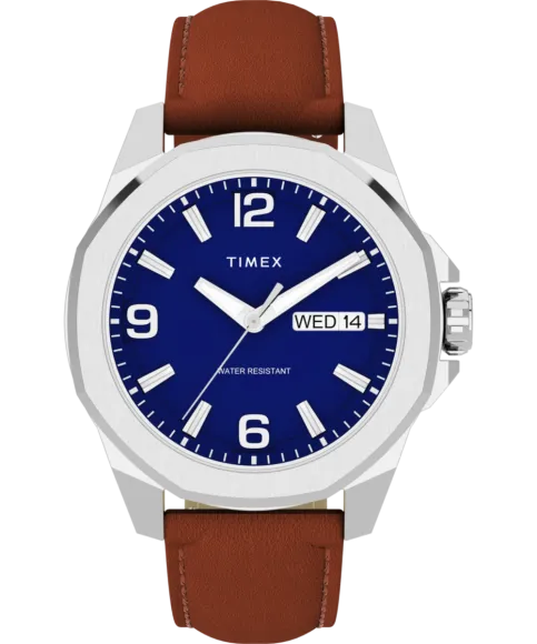 Das Timex® Analogue 'Trend Essex' Herrenarmbanduhr TW2W92800 ist die perfekte Kombination aus Funktionalität und Stil, speziell für den modernen Mann gestaltet. Diese Uhr strahlt mit ihrem auffälligen blauen Zifferblatt, das wunderschön mit dem eleganten silbernen Gehäuse aus Messing kontrastiert, eine außergewöhnliche Präsenz aus. Das durchdacht gestaltete runde Gehäuse hat einen Durchmesser von 46 mm und eine Dicke von 10 mm. Es wird durch ein Mineralglas geschützt, das Haltbarkeit und Klarheit gewährleistet, sodass Sie stets einen klaren Blick auf die Uhrzeit und das Datum haben. Das Datums- und Wochentagsfenster erhöht die Benutzerfreundlichkeit und macht sie zur idealen Wahl für vielbeschäftigte Profis, die organisiert und pünktlich bleiben möchten. Das herausragende Design wird durch ein reichhaltiges braunes Lederarmband ergänzt, das eine Breite von 22 mm und eine Länge von 21 cm hat und sowohl Komfort als auch einen Hauch von Eleganz bietet. Der Schnallenverschluss sorgt für einen sicheren Sitz und ermöglicht es Ihnen, die Uhr mit Selbstvertrauen im Laufe der täglichen Routine zu tragen. Mit einer Wasserbeständigkeit von bis zu 5 bar ist diese Uhr darauf ausgelegt, den Strapazen des täglichen Gebrauchs standzuhalten. Sie eignet sich für eine Vielzahl von Anlässen, von lässigen Ausflügen bis hin zu professionellen Meetings. Mit einem Gewicht von nur 97 Gramm bietet sie die perfekte Balance zwischen Robustheit und Tragekomfort. Die Timex® Analogue 'Trend Essex' Herrenarmbanduhr kombiniert klassisches Uhrmacherhandwerk mit modernem Design, wodurch sie ein vielseitiges Accessoire ist, das jedes Outfit aufwertet, ganz gleich, ob Sie im Vorstandssteg sitzen oder einen Abend in der Stadt verbringen. Shop Timex® Analogue 'Trend Essex' Herrenarmbanduhr bei Ormoda