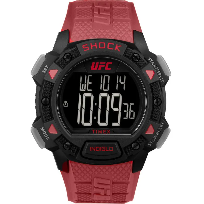 Tauchen Sie ein in die Welt der kraftvollen Leistung mit der Timex® Digital 'Ufc Core Shock' Herren Uhr TW4B27600. Dieses Zeitmesser ist speziell für den modernen Mann konzipiert, der sowohl Funktionalität als auch Stil schätzt. Das schwarze Res Gehäuse mit einem Durchmesser von 44mm und einer Dicke von 15mm verleiht der Uhr ein elegantes und zugleich robustes Erscheinungsbild, bereit für jedes Abenteuer. Das auffällige schwarze Zifferblatt wird durch strapazierfähiges Mineralglas geschützt und sorgt für eine klare Sichtbarkeit unter verschiedenen Bedingungen. Diese Uhr, die für einen aktiven Lebensstil entwickelt wurde, verfügt über ein leuchtend rotes Plastikband, das mit einer Länge von 21cm und einer Breite von 26mm einen angenehmen Tragekomfort bietet. Der Gurtverschluss erhöht die Sicherheit, sodass Sie sich auf das konzentrieren können, was Sie am meisten lieben. Ausgestattet mit einem Quarzwerk garantiert diese Uhr präzise Zeitmessung. Mehrere Funktionen machen sie zu Ihrem perfekten Begleiter: Stoppuhr, Countdown-Timer und Alarmfunktionen halten Sie organisiert, während das Indiglo-Licht sicherstellt, dass Sie die Uhrzeit auch bei schwachem Licht ablesen können. Mit einer Wasserdichtigkeit von 10 bar können Sie sie sorglos beim Schwimmen oder anderen Wassersportarten tragen. Das digitale Display bietet Ihnen auf einen Blick wichtige Informationen, einschließlich Tag und Datum, und vereint so die sportliche Ästhetik mit praktischer Anwendbarkeit. Im Grunde ist die Timex® Digital 'Ufc Core Shock' mehr als nur eine Uhr; sie ist ein Lifestyle-Accessoire, das Resilienz und Stil verkörpert. Shop Timex® Digital 'Ufc Core Shock' Herren Uhr bei Ormoda