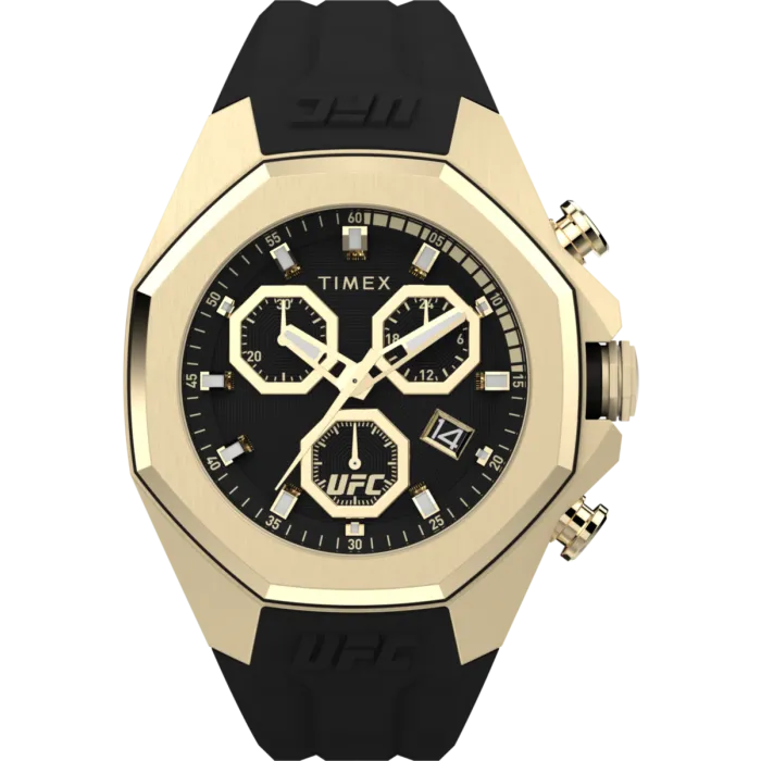 Die Timex® Chronograph 'Ufc Pro' Herrenuhr TW2W69800 ist ein Zeugnis der Fusion von robuster Funktionalität und raffiniertem Stil. Mit einem Durchmesser von 45 mm ist dieses auffällige Zeitmessergehäuse aus strapazierfähigem Edelstahl gefertigt, um Langlebigkeit selbst in den anspruchsvollsten Umgebungen zu gewährleisten. Das goldfarbene Gehäuse in Kombination mit dem schwarzen Zifferblatt bietet eine kühne Ästhetik, die perfekt für den aktiven Mann ist. Das Mineralglasfenster fügt eine Schutzschicht hinzu und gewährleistet gleichzeitig eine klare Sicht auf die leuchtenden Zeiger und Ziffern, sodass Sie die Zeit unter allen Bedingungen leicht ablesen können. Diese Uhr ist für diejenigen konzipiert, die einen Lebensstil voller Abenteuer führen und einen zuverlässigen Begleiter benötigen. Mit einer Wasserdichtigkeit von bis zu 10 Bar können Sie sie sorglos während Ihrer Workouts oder beim Wassersport tragen. Das Silikonarmband bietet nicht nur Komfort, sondern ist auch für Langlebigkeit ausgelegt. Es hat eine großzügige Länge von 21 cm und eine Breite von 24 mm. Der Schnallenverschluss sorgt für einen sicheren Sitz und macht sie zum idealen Begleiter für unterwegs. Die Chronographenfunktion ermöglicht präzise Zeitmessung und wird ergänzt durch Funktionen wie einen Stoppuhr und eine 24-Stunden-Anzeige. Die Datumsanzeige fügt praktische Aspekte hinzu, während die leuchtenden Zeiger sicherstellen, dass Sie die Zeit bei schwachem Licht ablesen können. Die verschraubte Krone erhöht die Wasserdichtigkeit und gibt Ihnen die Sicherheit, dass dieses Zeitmesser Ihren aktiven Lebensstil standhalten kann. Mit einem Gewicht von 140 Gramm erreicht sie das perfekte Gleichgewicht zwischen robuster Konstruktion und tragbarem Komfort für den modernen Mann. Shop Timex® Chronograph 'Ufc Pro' Herrenuhr bei Ormoda