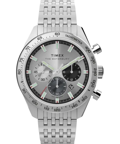Die Timex® Chronograph 'Waterbury Traditional' Herren Uhr TW2Y18700 ist eine atemberaubende Darstellung zeitloser Handwerkskunst und moderner Funktionalität. Mit deren Erbe hat Timex die Waterbury Traditional entworfen, um den Stil und die Bedürfnisse des heutigen anspruchsvollen Herren zu entsprechen. Diese Uhr vereint mühelos klassisches Design mit einem modernen Touch und ist somit das ideale Accessoire für alle Gelegenheiten – von Vorstandssitzungen bis zu Wochenendausflügen. Das schicke silberne Gehäuse, aus robustem Edelstahl gefertigt, sorgt für Langlebigkeit und verleiht gleichzeitig eine elegante Ausstrahlung. Ihr rundes Gehäusedesign wird durch eine bemerkenswerte Tachymeter-Funktion akzentuiert, die eine präzise Zeitmessung ermöglicht. Die leuchtenden Zeiger und das 24-Stunden-Display garantieren Lesbarkeit unter verschiedenen Lichtverhältnissen und verbinden Praktikabilität mit Eleganz. Mit einem Gehäusedurchmesser von 41 mm und einer Dicke von 12,5 mm ist dieses Zeitmessgerät zwar massiv, jedoch bequem am Handgelenk zu tragen. Das Mineralglas-Zifferblatt bietet zuverlässigen Schutz, während die silberne Zifferblattfarbe einen polierten Look hinzufügt. Der Faltverschluss mit Druckknopf sichert die Uhr fest und sorgt für Komfort beim Tragen. Das Edelstahlarmband misst 21 cm in der Länge und 20 mm in der Breite und fügt sich harmonisch in die zeitgenössische Ästhetik der Uhr ein. Sie ist bis zu 10 bar wasserdicht, was bedeutet, dass diese Uhr nicht einfach ein modisches Statement ist; sie ist dafür gestaltet, eine Vielzahl von Umgebungen standzuhalten. Die Hinzufügung einer Datumsfunktion erhöht die Praktikabilität und stellt sicher, dass Sie nie überraschend überrascht werden. Die Timex® Chronograph verkörpert die perfekte Mischung aus Stil und Nützlichkeit – ein unverzichtbares Stück für den modernen Mann.Shop Timex® Chronograph 'Waterbury Traditional' Herren Uhr bei Ormoda