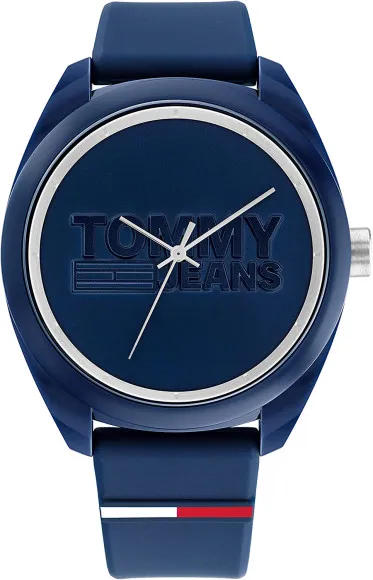 Präsentation der Tommy Hilfiger® Analogue 'San Diego' Herrenarmbanduhr 1791927, eine perfekte Fusion aus Stil und Funktionalität. Diese lässige Uhr spricht den modernen Lebensstil des Mannes an und kombiniert mutige Ästhetik mit praktischen Funktionen. Das Uhrengehäuse, das in einem auffälligen Blau gehalten ist, besteht aus strapazierfähigem Kunststoff, der Langlebigkeit und Widerstandsfähigkeit gegen Witterungseinflüsse gewährleistet. Mit einem Durchmesser von 44 mm und einer Dicke von nur 10 mm sitzt sie bequem am Handgelenk und macht gleichzeitig eine selbstbewusste Aussage. Das blaue Zifferblatt ist nicht nur visuell ansprechend; es verfügt über ein Mineralglasfenster, das kratzfest ist und dafür sorgt, dass Ihre Uhr stets frisch und sauber aussieht. Die analoge Anzeige verleiht ein klassisches Gefühl und macht sie sowohl für lässige Ausflüge als auch für formelle Anlässe ideal. Angetrieben wird die Uhr von einem zuverlässigen Quarzwerk, das Genauigkeit in Ihrer täglichen Zeitmessung garantiert. Der Komfort steht bei einem blauen Gummiband an erster Stelle, das nicht nur das Gesamtbild der Uhr ergänzt, sondern auch einen sicheren Sitz am Handgelenk bietet. Mit einer Länge von 21 cm und einer Breite von 19 mm ist das Band verstellbar, um unterschiedlichen Handgelenkgrößen gerecht zu werden, was Vielseitigkeit für den Lebensstil des Trägers sicherstellt. Der Schnallenverschluss sorgt für einfaches Anlegen und Sicherheit vor versehentlichem Abrutschen. Mit einer Wasserbeständigkeit von 3 Bar hält diese Uhr geringfügigen Spritzern stand und eignet sich für den täglichen Gebrauch. Mit einem Gewicht von nur 55 Gramm ist die Tommy Hilfiger San Diego Uhr leicht, aber robust und ideal für den aktiven Mann, der Komfort und Stil schätzt. Insgesamt verkörpert sie die Essenz urbaner Raffinesse und ist ein unverzichtbares Accessoire für die Garderobe eines jeden Mannes.Shop Tommy Hilfiger® Analogue 'San Diego' Herrenarmbanduhr bei Ormoda