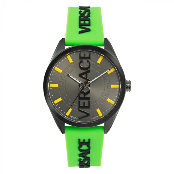 Die Versace® Analogue 'V-vertical' Herrenuhr VE3H00923 verkörpert eine verlockende Mischung aus Raffinesse und lässiger Eleganz. Entworfen für den modernen Mann, strahlt dieses Zeitmesser Selbstbewusstsein mit seinem schlanken Design und luxuriösen Finish aus. Das schwarze runde Gehäuse besteht aus robustem Edelstahl und hat einen Durchmesser von 42 mm sowie eine Gehäusehöhe von 9 mm, was für einen angenehmen Tragekomfort sorgt. Das auffällige schwarze Zifferblatt, geschützt durch Saphirglas, gewährleistet, dass Ihr Stil makellos bleibt, während es Klarheit und Haltbarkeit im täglichen Leben bietet. Für diejenigen, die die feinen Dinge im Leben schätzen, wird die Uhr von einem präzisen Quarzmechanismus angetrieben, sodass Sie keinen Moment verpassen. Das Design der Uhr wird durch ein lebhaftes grünes Silikonarmband, das 21 cm lang und 19 mm breit ist, aufgewertet und garantiert nicht nur Komfort, sondern bringt auch einen modernen Flair. Gesichert mit einer zuverlässigen Dornschließe ist dieses Zeitmesser auf Druck bis zu 5 Bar ausgelegt, was es perfekt für den täglichen Gebrauch macht, egal ob Sie im Büro sind oder Ihre Freizeit genießen. Mit einem Gewicht von nur 66 Gramm werden Sie vielleicht vergessen, dass Sie es tragen, sodass diese Uhr der perfekte Begleiter für jeden Anlass ist. Betreten Sie ein Reich von Funktionalität und Luxus mit der Versace 'V-vertical'.Shop Versace® Analogue 'V-vertical' Herrenuhr bei Ormoda