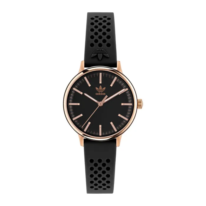 Step into a world of casual elegance with the Adidas Originals Analogue 'Code One Xsmall' Women's Watch AOSY23026. This stunning timepiece seamlessly combines comfort and style, making it the perfect accessory for every occasion. Designed specifically for women, its rose gold accents beautifully enhance the round stainless steel case, with a modest diameter of 32mm that sits gently on the wrist. The minimalistic yet striking black dial features a durable mineral glass window, ensuring longevity and resilience. The watch is powered by reliable quartz movement, guaranteeing precise timekeeping. The sleek black silicone band not only provides excellent durability but also ensures a comfortable fit, measuring 19cm in length and 12mm in width. The buckle clasp keeps it securely fastened while adding an effortless touch to your look. With a thickness of just 7.5mm, this lightweight watch, weighing only 33 grams, feels as good as it looks. Rated to withstand water pressure up to 5 bars, it is perfect for everyday wear, whether you’re at the office, running errands, or out with friends. It's all about versatility with the 'Code One Xsmall' watch. Add a hint of sophistication to your casual ensembles while reveling in the sporty spirit of the Adidas Originals brand, which prides itself on empowering women through stylish yet functional accessories. Embrace the perfect balance of leisure and chic with this captivating timepiece, designed to become your go-to fashion staple.