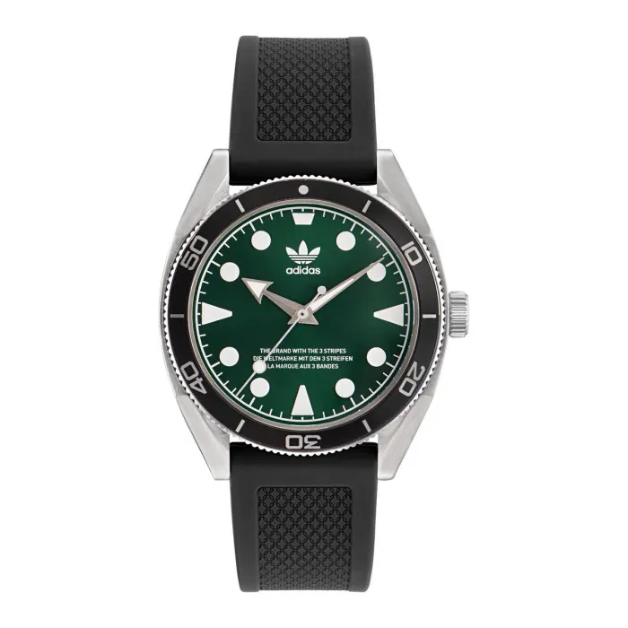The Adidas Originals® Analogue 'Edition Two' Unisex's Watch AOFH23008 is a remarkable piece, crafted to cater to both style and functionality. With its striking green dial, this watch features a round stainless steel case that measures 43mm in diameter and 11.28mm in thickness. The pilot-style watch is not just visually appealing; it boasts a turnable bezel that adds versatility to its design. Mineral glass covers the dial, ensuring durability while the silicone band, which is 20cm long and 20mm wide, guarantees comfort for daily wear. The band comes in a sleek black color that complements the overall aesthetic, and it closes securely with a classic buckle clasp.