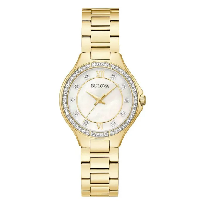 The Bulova® Analogue Women's Watch 98L295 is a stunning expression of elegance and craftsmanship. This exquisite timepiece is designed for the modern woman who values both style and functionality. Featuring a beautiful mother of pearl dial, this watch serves as a perfect canvas to showcase its stylish gold stainless steel case and band. With a case diameter of 30mm and a thickness of 9mm, it gracefully adorns the wrist, making it not only a utility but a statement of personal style. Equipped with a quartz movement, the watch ensures precision in timekeeping, providing you with reliability for every occasion. The round case style is timeless, and the stone settings on the bezel add just the right amount of sparkle, making this watch suitable for both daily wear and special events. Its gold stainless steel band, measuring 19cm in length and 14mm in width, is secured by a fold-over clasp with a push-button for ease of wear. This timepiece boasts water resistance up to 3 bars, allowing you to wear it without worry during daily activities. The mineral glass window protects the beautiful dial from scratches, ensuring durability while preserving its pristine appearance. The lug to lug height of 34mm provides a comfortable fit on the wrist. With all these remarkable attributes, the Bulova® Analogue Women's Watch 98L295 is more than just a watch; it is a gorgeous accessory that enhances your charm and complements your wardrobe with grace.