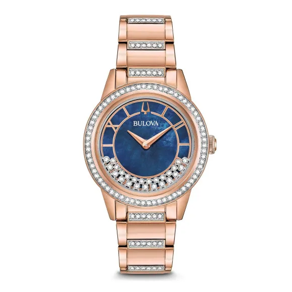 Discover elegance that glistens with every turn of your wrist with the Bulova 'Turnstyle' Women's Watch 98L247. From the esteemed house of Bulova, founded in 1875, this timepiece reflects a legacy of innovation blended with a modern feminine allure. The 'Turnstyle' model is not just a watch, it's a statement of sophisticated taste and a celebration of craftsmanship. Encased in lustrous rose gold, the sleek stainless steel silhouette spells luxury with a 32mm round case that carries the perfect blend of understated sophistication and statement. The gleaming stone settings on the bezel twinkle like stars against the night sky, effortlessly drawing the eye. A mother of pearl dial bathed in an iridescent glow serves as the backdrop for the minimalist rose gold-tone hands and hour markers, enhancing readability with a layer of luxurious charm. Protected by durable mineral glass, this watch ensures both beauty and resilience. The fluidity of the rose gold stainless steel band, measuring 19cm in length and 14mm in width, embraces the wrist like a piece of fine jewelry, fastening securely with a deployment clasp designed for both comfort and style. The Turnstyle watch, featuring Quartz movement, guarantees precision, while the 3 bars of water resistance assure that your investment remains safe from splashes and rain showers. From a serene office environment to the lively atmosphere of a dinner party, this timepiece transitions with ease, its analogue display upholding a classic aesthetic in a modern world. Bulova's dedication to creating timepieces with finesse ensures that the 'Turnstyle' watch stands as an iconic emblem of the contemporary woman—dynamic, graceful, and forever in style.Shop Bulova 98L247 at Ormoda