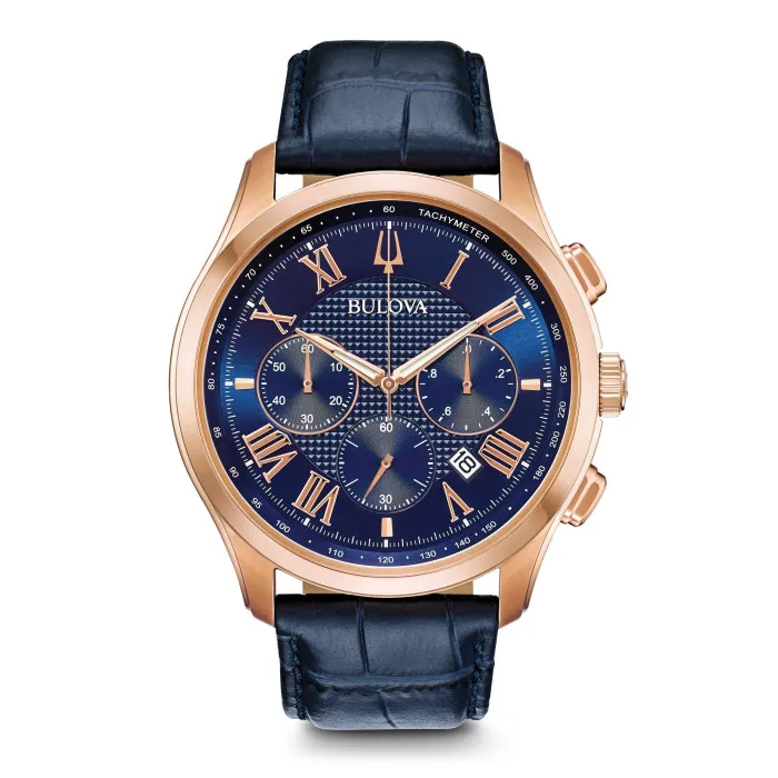 The Bulova® Chronograph 'Wilton' Men's Watch 97B170 effortlessly combines elegance and functionality, making it a must-have for any modern man. With a standout rose gold case that boasts a substantial 46mm diameter, this watch commands attention while remaining refined. The robust stainless steel construction adds to its durability, ensuring it can withstand the test of time and active lifestyles. A distinctive brown dial, protected by mineral glass, hosts elegantly crafted chronograph dials that elevate its mechanical charm. The date feature seamlessly integrates into the watch's iconic design, adding practicality to its sophisticated appearance. The watch is completed with a rich blue leather band that contrasts beautifully against the rose gold casing, providing both comfort and style. The 22cm band can be customized to fit comfortably around the wrist, and the deployment clasp assures a snug and secure fit. With a 3 ATM water resistance rating, the 'Wilton' can accompany you through various everyday situations without worry. This watch isn't just a timepiece; it’s a versatile accessory that enhances any outfit, from business casual to a night out. Experience luxury and precision in one exquisite timepiece that defines modern masculinity.