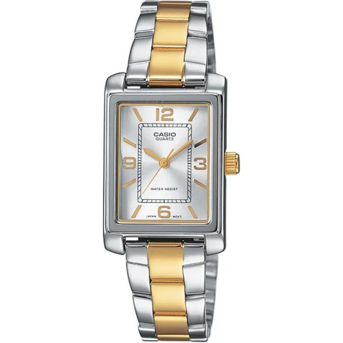 The Casio® Analogue 'Collection' Women's Watch LTP-1234PSG-7AEG is a stunning piece that embodies elegance and sophistication. Designed with a dress style in mind, this timepiece accentuates the beauty of any outfit, whether for a formal event or a casual outing. Its rectangular silver case is crafted from durable stainless steel, offering both strength and a contemporary look that empowers the wearer. Measuring 26mm in length and 21mm in width, with a sleek thickness of just 7mm, it sits gracefully on the wrist. The dial features a refined silver hue, subtly highlighting the watch hands and markers, all protected under a tough mineral glass window that ensures longevity and clarity. The multicolour band, made from high-quality stainless steel, adds a unique twist to the overall design, reflecting the vibrant personality of the modern woman. With a band length of 19cm and width of 13mm, this piece not only looks fantastic but also provides a comfortable fit. Equipped with a quartz movement, this timepiece promises precision and reliability, ensuring you are always on time for your most important moments. The fold-over clasp with a push button is secure and easy to use, allowing you to slip the watch on and off effortlessly. Featuring a water resistance of up to 3 bars, it caters to the needs of an active lifestyle while maintaining its chic appearance. The Casio® Analogue 'Collection' women's watch is an exquisite blend of fashion and functionality, making it an ideal choice for every woman's watch collection.Shop Casio LTP-1234PSG-7AEG at Ormoda