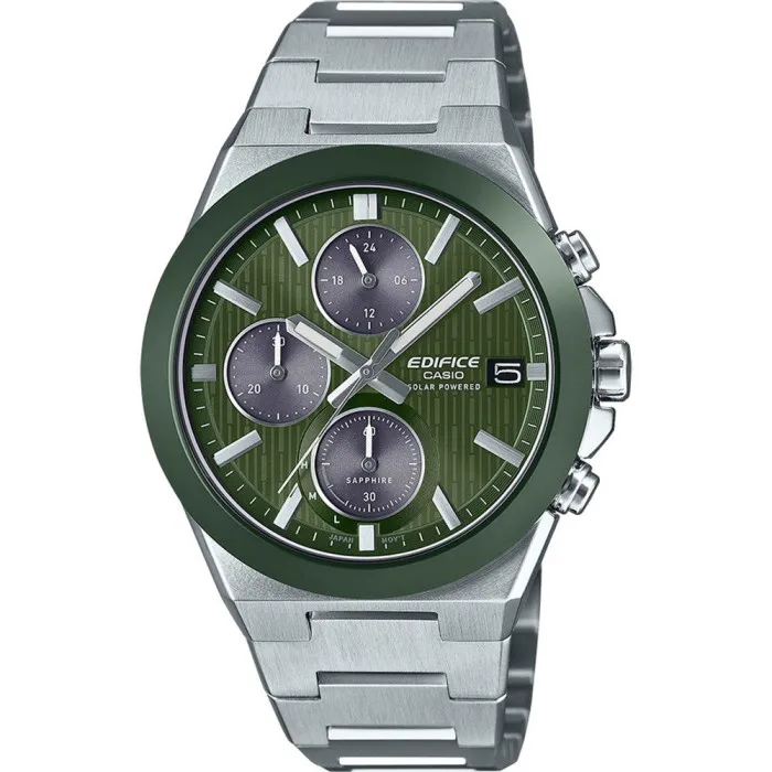 The Casio Chronograph 'Edifice' Men's Watch EFS-S650D-3AEF is a true testament to precision and elegance, designed especially for the modern gentleman. With a sleek round case crafted from durable stainless steel, it features a striking green dial protected by sapphire glass, ensuring clarity and resistance to scratches over time. Measuring 40mm in diameter and 12mm thick, this timepiece strikes a perfect balance between boldness and wearability, making it suitable for both formal occasions and everyday use. The watch band, also made of stainless steel, offers not only resilience but a sophisticated aesthetic that complements the case brilliantly. Measuring 21cm in length and 22mm in width, it easily fits a variety of wrist sizes. With a quartz movement powering its mechanisms, the Edifice guarantees reliability and accuracy, while the solar-powered feature allows for sustainable operation. With a 10-bar water resistance rating, this watch can be worn with confidence in various environments. Its chronograph display caters to those who appreciate functionality, featuring a stopwatch and a 24-hour display. Luminous hands provide visibility in low-light conditions, ensuring that you stay on time regardless of the hour. Completing the design is a fold-over clasp with a push button for easy wear, enhancing the overall user experience. The Casio Edifice represents a harmonious blend of sophisticated style and cutting-edge technology, ensuring you always make a statement while keeping precise time.Shop Casio EFS-S650D-3AEF at Ormoda
