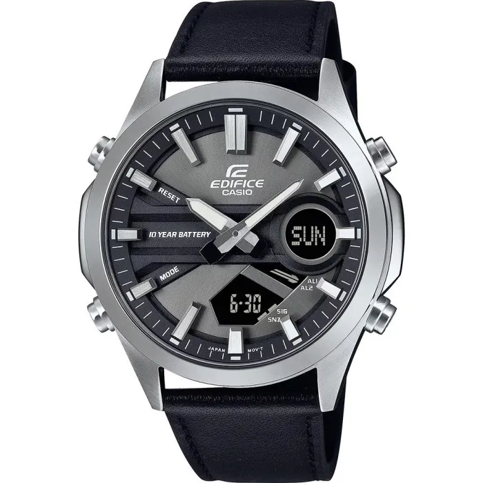 Introducing the Casio Analogue-digital 'Edifice' Men's Watch EFV-C120L-8AEF, a superb blend of modern technology and classic design, perfect for the discerning gentleman. With a robust round case diameter of 45mm and a sleek silver stainless steel construction, this watch radiates elegance and strength. The black dial, secured with mineral glass, showcases an innovative analogue-digital display. This unique feature ensures that you stay both stylish and informed, making it an ideal companion for various occasions - from casual meetups to sophisticated gatherings. Comfort is paramount in the Casio Edifice, as it features a black leather band with a length of 21cm and a width of 21mm, allowing for a tailored fit on the wrist. The watch’s buckle clasp adds to its user-friendly design, ensuring that it stays firmly in place. This timepiece also embraces functional excellence, offering features like a day-date calendar, stopwatch, countdown timer, alarm, and luminous hands that light up in the dark, enhancing its practicality. Built to withstand daily demands, the watch boasts an impressive water resistance of 10 bars, making it suitable for both swimming and snorkeling. Weighing in at just 76 grams, the watch offers a feather-light wear without compromising its durability. The Casio Edifice is not merely a watch; it symbolizes your style and determination. This watch is perfect for men who appreciate functionality blended with a sophisticated edge. Elevate your wrist game with this remarkable timepiece that speaks volumes about your personality.