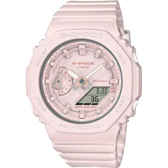 Introducing the Casio® Analogue-digital 'G-shock' Women's Watch GMA-S2100BA-4AER, a perfect fusion of style and functionality designed specifically for the modern woman. This stunning watch showcases a vibrant pink color that exudes femininity while maintaining a sporty allure. The unique analogue-digital display offers you the best of both worlds, allowing you to effortlessly switch between traditional timekeeping and digital functionality. Crafted from durable resin, the round case measures 42mm in diameter, making it both lightweight and comfortable to wear. Its 11mm thickness adds a sleek element, ensuring that it fits both casual and sporty occasions seamlessly. Whether you are on a morning run or hitting the town with friends, the Casio 'G-shock' watch is designed to rise to any challenge you face. With a water-resistant rating of 20 bars, this timepiece can handle splashes and submersion with ease, making it a reliable companion for your outdoor adventures. The mineral glass window provides a protective shield against scratches and damage, ensuring your watch stays beautiful through everyday wear. The watch band, made from high-quality plastic, is a delicate shade of pink that perfectly complements the case and dial. Measuring 22mm in width and 21cm in length, it secures comfortably around your wrist with a classic buckle clasp. This watch also features an array of practical tools including a stopwatch, world time display, timer, alarm, and light, making it an essential accessory for any active lifestyle. Each functional detail merges seamlessly with its aesthetic appeal, allowing this watch to be as versatile as it is luxurious.