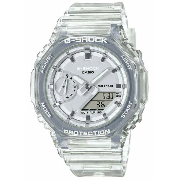 The Casio® Analogue-digital 'G-shock' Women's Watch GMA-S2100SK-7AER is the perfect blend of style and practicality. This stunning timepiece boasts a transparent case made from durable resin, making it lightweight yet highly resilient. With a case diameter of 42mm and a thickness of just 11mm, it fits comfortably on the wrist without sacrificing any features. The striking silver dial is protected by mineral glass, ensuring clarity and durability while accommodating an analogue-digital display. You'll appreciate the elegant touch brought by luminous hands, and the day-date calendar adds to the watch's practicality. The transparent plastic band, measuring 21cm in length and 22mm in width, is both fashionable and functional, featuring a secure buckle clasp for peace of mind during your daily activities. Whether you're scaling mountains or enjoying a day out, this watch also includes essential features like a stopwatch, countdown timer, alarm, and world time function, making it ideal for any adventure. With a waterproof rating of 20 bars, you can wear this timepiece confidently in any weather condition. A stylish statement piece that embodies both sophistication and toughness, this G-Shock model is crafted to cater to modern women seeking a watch that is as functional as it is beautiful.
