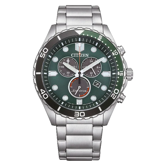 The CitizenĀ® Chronograph 'Of Sporty Aqua' Men's Watch AT2561-81X is a perfect blend of elegance and functionality. This stunning timepiece is designed specifically for the modern man who appreciates both style and performance. With a robust stainless steel case measuring 43mm in diameter and a thickness of 11mm, this watch promises durability while exuding sophistication. The striking green dial, protected by mineral glass, not only adds character but also features luminous hands and numbers, ensuring visibility in the depths of the ocean or during a night out. This watch excels as a diver's watch, rated for a water resistance of up to 10 bars, making it both an excellent adventurer's companion and a bold fashion statement. The watch's Eco-Drive movement harnesses energy from any light source, eliminating the need for battery replacements. The chronograph functionality is not just a feature but an essential tool for those who value precision. Use the stopwatch and 24-hour display to keep track of time while engaging in your favorite water sports or outdoor adventures. The bezel with numbers provides added utility when measuring elapsed time, making it a favorite among diving enthusiasts. The stainless steel band with a secure fold-over push-button clasp not only enhances comfort but also assures a snug fit for various wrist sizes. With a band length of 21cm and a width of 21mm, itās designed to be worn effortlessly throughout your day. Whether you're at work or out on the water, the CitizenĀ® Chronograph 'Of Sporty Aqua' is more than just a watch; it's an essential part of your lifestyle.Shop Citizen AT2561-81X at Ormoda