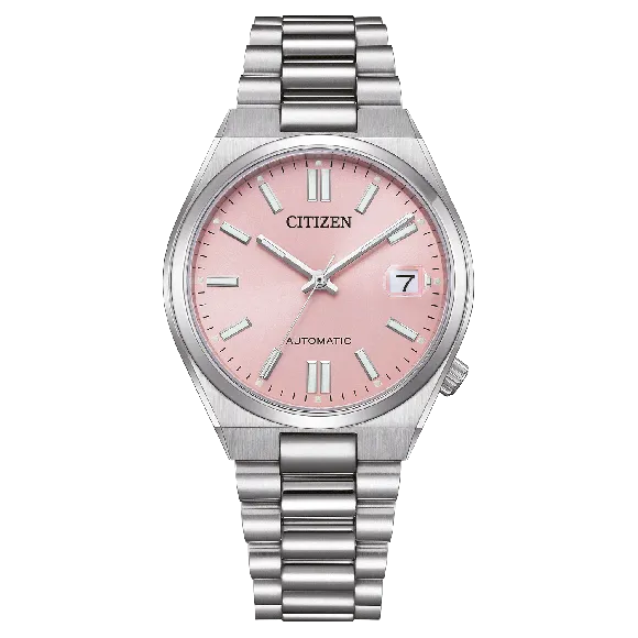 Introducing the CitizenĀ® Analogue 'Tsuyosa' Women's Watch NJ0200-50Z, a stunning accessory designed for the modern woman who values elegance and functionality. This exquisite timepiece features a beautiful pink dial that radiates femininity and sophistication. Adorned with a sleek stainless steel round case, its 37mm diameter is perfectly balanced, ensuring it comfortably fits on your wrist. The watch boasts an automatic movement, promising unrivaled precision while eliminating the need for battery replacements. Its scratch-resistant sapphire glass protects the dial while allowing easy visibility of the date feature, adding a practical touch to its luxurious design. The lustrous silver stainless steel band wraps gently around the wrist, measuring 19cm in length and 19mm in width, secured by a fold-over push-button clasp for effortless wear. With a water resistance rating of 5 bars, this watch is perfect for the woman who leads an adventurous lifestyle without sacrificing style. Whether you're heading to the office or enjoying a night out, this timepiece will complement your wardrobe beautifully, making a statement wherever you go.Introducing CitizenĀ® Analogue 'Tsuyosa' Women's Watch NJ0200-50Z