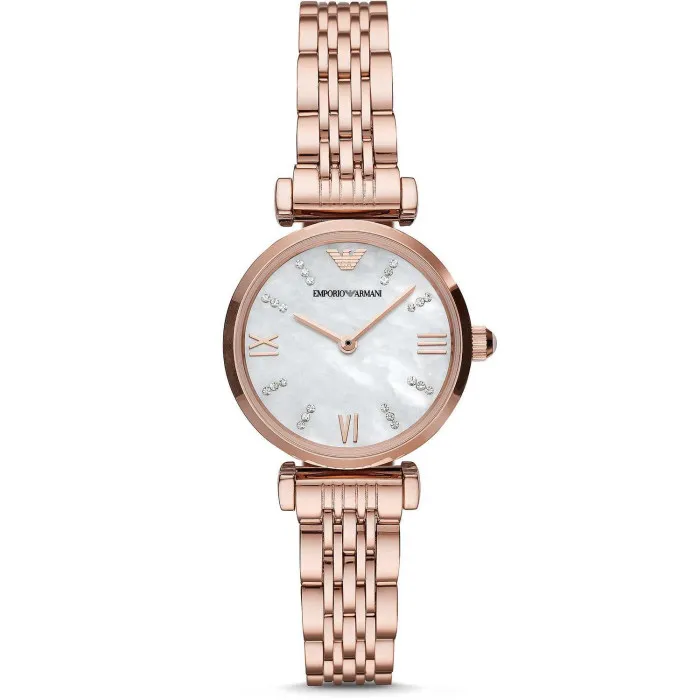 Introducing the Emporio ArmaniĀ® Analogue 'Gianni T-bar' Women's Watch AR11316, a sophisticated embodiment of luxury that speaks directly to the modern woman's style sensibilities. Characterized by its round stainless steel case in a stunning rose gold hue, this watch radiates elegance. With a delicate 28mm diameter and only 7mm thick, it nestles gracefully on the wrist, making a bold yet gentle statement suitable for any occasion. The watch features a mesmerizing mother of pearl dial, which captures and reflects light beautifully, creating an enchanting visual experience that enhances any outfit. With a robust quartz movement, this timepiece ensures accurate timekeeping while maintaining a classic analogue display that is easy to read at a glance. The arrangement is complemented by a mineral glass window, ensuring both functionality and durability. The watch band, also in rose gold stainless steel, boasts a length of 19cm and a width of 12mm, providing a secure fit thanks to its deployment clasp design. The 3-bar water resistance means you can wear this stylish accessory without worry, whether you’re at a formal event or enjoying a casual day out. The Emporio Armani brand stands for sophistication and modernity, and this watch reflects those values effortlessly. Timeless in style yet contemporary in finish, the Gianni T-bar watch is an essential addition to every jewelry collection. It is designed for women who appreciate not just a functional timepiece but a luxurious accessory that complements their lifestyle and personal style with grace.