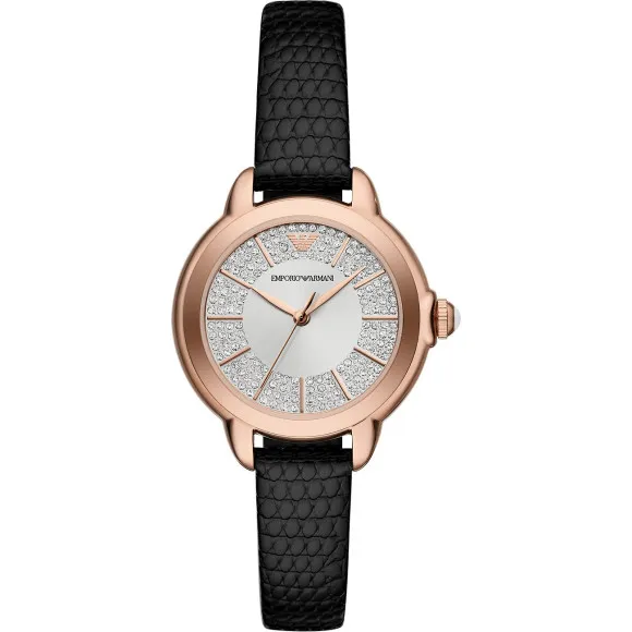The Emporio ArmaniĀ® Analogue 'Mia' Women's Watch AR11631 is a stunning piece that embodies elegance and sophistication, perfect for any occasion. This exquisite timepiece features a round stainless steel case in a lustrous rose gold tone, measuring 32mm in diameter and only 8mm thick, ensuring a refined profile on the wrist. The watch showcases a beautiful silver dial beneath durable mineral glass, perfectly complementing its luxurious appeal. Whether you are at a formal event or enjoying a night out, the 'Mia' watch adds a touch of glamour to your style. Designed with the modern woman in mind, the watch is powered by a reliable quartz movement, ensuring accurate timekeeping at all times. The black leather band is not only stylish but also exceptionally comfortable, measuring 19cm in length and 11mm in width. The polished black leather adds to the watchās overall luxe aesthetic, while the traditional buckle clasp provides a secure fit, allowing for effortless wear. With a water resistance of up to 5 bars, this timepiece is as practical as it is beautiful, suitable for day-to-day wear while maintaining its sophisticated look. The Emporio Armani brand is synonymous with quality and style, making the 'Mia' watch an essential addition to any jewelry collection, offering versatility and timeless elegance for any fashionable woman. Elevate your accessory game with this captivating watch that celebrates the essence of modern femininity.Shop Emporio Armani AR11631 at Ormoda