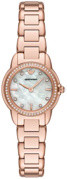 Introducing the Emporio Armani Analogue 'Mia' Women's Watch AR11671, a beautiful blend of elegance and sophistication. This stunning watch features a delicate rose gold case, measuring 26mm in diameter and only 7mm in thickness, making it perfect for graceful wrists. The round shape gives it a classic look, while the embellished bezel with exquisite stone settings adds a touch of luxury to your ensemble. The watch is powered by precise quartz movement, ensuring consistent timekeeping for the modern woman. The dial is an enchanting mother of pearl, radiating iridescent hues that change with the light, creating a unique and glamorous effect. Protected by mineral glass, the dial is both beautiful and durable, allowing you to enjoy its beauty without fear of damage. With a deployment clasp, fastening the watch is effortless, and the secure fit of the stainless steel band ensures comfort throughout the day. With a band length of 19cm and a width of 13mm, this watch finds the perfect balance between style and function. Designed with a water resistance of 5 bars, the Emporio Armani 'Mia' watch gracefully handles those unexpected splashes, making it a reliable companion for any occasion. This watch is more than just a timepiece; itās a statement of luxury and elegance, suitable for the woman who cherishes both style and functionality. Whether dressing up for an event or elevating your everyday attire, the 'Mia' watch will be your go-to accessory, embodying both grace and confidence in every tick.Shop Emporio Armani AR11671 at Ormoda