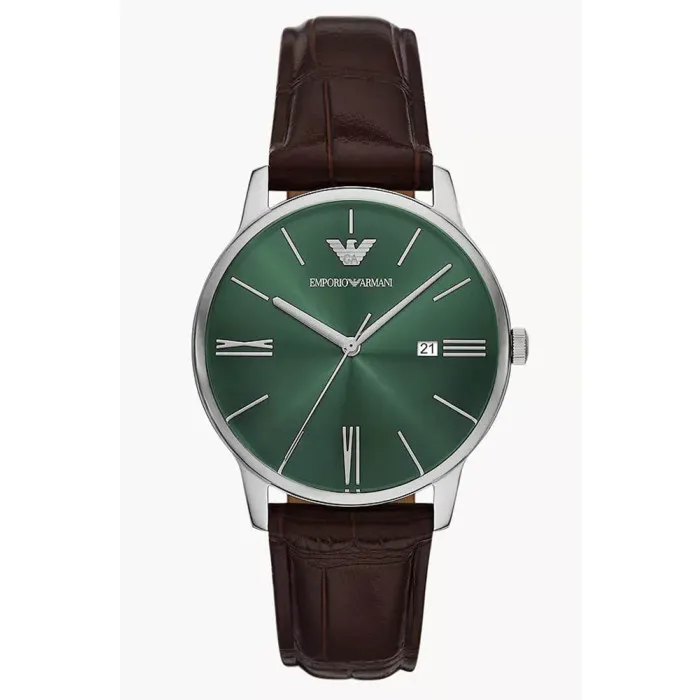 Discover the elegance of the Emporio ArmaniĀ® Analogue 'Minimalist' Men's Watch AR11672, where sophistication meets functionality. This exceptional timepiece combines a sleek design with practicality, making it the perfect accessory for the modern man. The watch features a round stainless steel case that measures 39mm in diameter and 10mm in thickness, ensuring a comfortable fit for everyday wear. Its captivating green dial is protected by durable mineral glass, providing a stylish yet resilient surface. The watch has a date calendar feature, adding a touch of practicality to its elegant appearance. The brown leather band adds warmth and depth, measuring 21cm in length and 19mm in width, topped off with a secure buckle clasp for peace of mind. With a water resistance of up to 5 bars, it is ideal for both daily activities and more adventurous outings. Whether you're in the office or enjoying a night out, this watch enhances your look with its subtle yet striking design. Driven by a reliable quartz movement, this timepiece offers precise timekeeping. The minimalist aesthetic makes it versatile for any occasion, allowing you to transition seamlessly from work to play. It’s perfect for men who appreciate a balance of class and practicality in their accessories, making it a valuable addition to any collection.