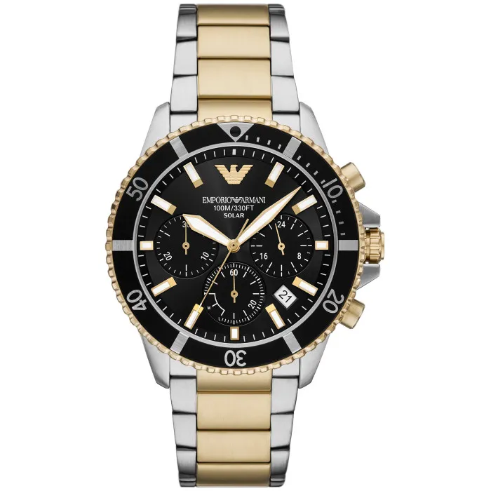 Emporio ArmaniĀ® Chronograph 'World Explorer' Men's Watch AR11680 embodies the essence of adventure and refined style. This exceptional timepiece is more than just a watch; it is a statement of luxury, designed for the modern man who seeks both functionality and sophistication. The striking multicoloured stainless steel case measures a robust 43mm in diameter, providing a bold presence on the wrist without compromising on comfort and elegance. With a case thickness of 13mm, this watch seamlessly combines a sporty look with a luxurious finish, making it suitable for various occasions, from casual outings to professional settings. At the heart of this watch lies a precise quartz movement, ensuring reliable timekeeping that you can trust. The black dial is both stylish and practical, featuring luminous hands and numbers that enhance visibility in low light conditions. The turnable bezel adds a layer of versatility, allowing you to track time or measure elapsed intervals with ease. Additionally, the chronograph function enhances this watch’s capabilities, making it perfect for those adventurous outings. The multicoloured stainless steel band, measuring 21cm in length and 21mm in width, complements the case beautifully and features a convenient fold-over clasp with a push button, ensuring a secure fit. With a water resistance of up to 10 bars, this watch is designed to withstand the rigors of exploration, whether in the office or outdoors. The Emporio Armani Chronograph 'World Explorer' is the ultimate accessory for the discerning gentleman who values style, durability, and functionality.