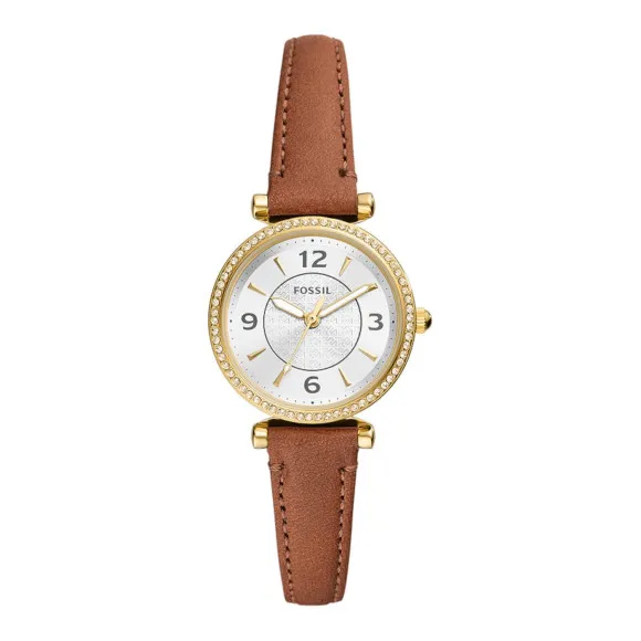 Experience the elegance of the FossilĀ® Analogue 'Carlie' Women's Watch ES5297, designed for the modern woman who appreciates style and sophistication. This stunning timepiece showcases a beautiful silver dial housed in a sleek gold stainless steel case, measuring 28mm in diameter and only 7mm thick, making it the perfect accessory for any occasion. Its round design adds a classic touch, while the brown leather band, measuring 12mm in width and 19cm in length, offers a comfortable fit and enhances its luxurious appeal. One of the standout features of this watch is its exquisite bezeled stone settings, which catch the light perfectly, lending a subtle sparkle to your wrist. The analogue display is protected by mineral glass, ensuring durability and clarity. With a water resistance of up to 5 ATMs, this watch is practical for everyday wear without compromising on style. Weighing only 20 grams, it's lightweight enough to wear all day without any discomfort. The FossilĀ® Analogue 'Carlie' watch is more than just a timepiece; it's a statement of elegance and femininity, perfect for dressing up your casual outfits or adding a chic touch to your formal attire. Whether you're attending a work meeting or a glamorous evening out, this watch is designed to complement your wardrobe with grace and sophistication.