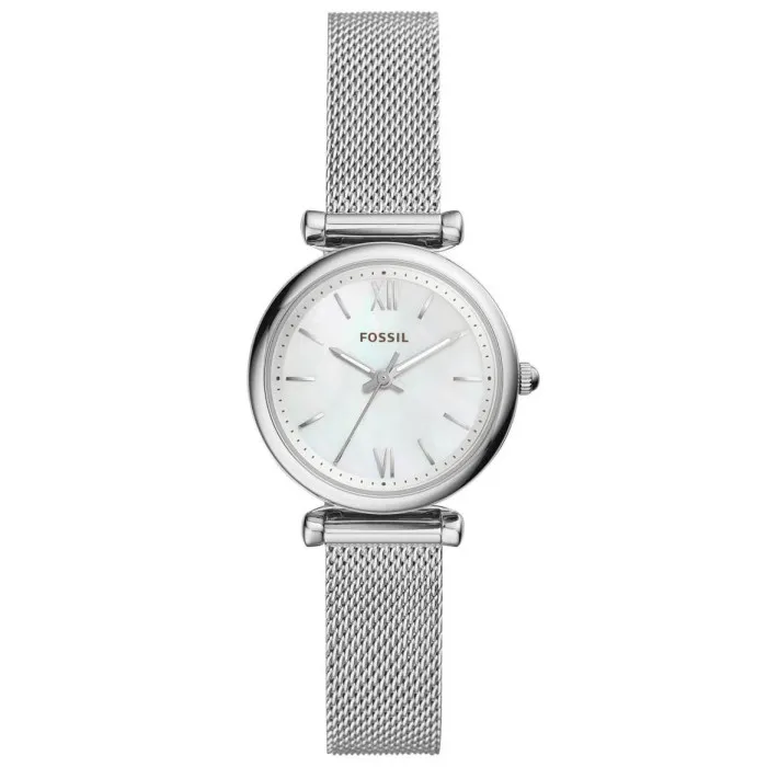 Introducing the Fossil® Analogue 'Carlie Mini' Women's Watch ES4432, a petite masterpiece that combines charm and sophistication. This watch, designed for the modern woman, embodies a casual elegance that makes it suitable for various occasions, from brunch with friends to a day at the office. The round silver stainless steel case features a subtle 28mm diameter, perfectly sized for those who prefer a watch that doesn’t overwhelm their wrist. With a slender 7mm thickness, it promises a comfortable fit. The stunning mother of pearl dial adds a touch of luxury, reflecting luminous colors with every glance, while the mineral glass dial window ensures durability and clarity.Shop Fossil ES4432 at Ormoda