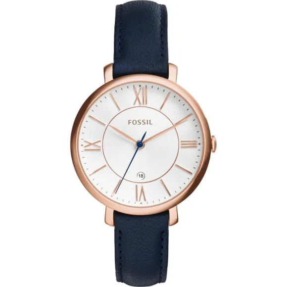 Step into elegance with the FossilĀ® Analogue 'Jacqueline' Women's Watch ES3843, a perfect blend of sophistication and style. Designed with the modern woman in mind, this casual yet chic timepiece features a stunning rose gold case crafted from durable stainless steel, ensuring longevity that matches your busy lifestyle. The round case, with a diameter of 36mm and a thickness of 8mm, offers a beautiful silhouette that is both bold and delicate at the same time. The silver dial, protected by high-quality mineral glass, is adorned with graceful hour markers that catch the light, giving it an effortlessly classy appeal. With a date calendar feature, you will always be on top of your schedule, making this watch not just a fashion statement but also a practical accessory. The allure of this timepiece is enhanced by its striking blue leather band that measures 19cm in length and 14mm in width. The classic buckle clasp secures it comfortably on your wrist, providing ease of wear for both special occasions and everyday use. Weighing only 31 grams, it's a lightweight companion that adds just the right amount of sparkle to your outfit. Designed to withstand the elements with water resistance up to 3 bars, the Fossil 'Jacqueline' is the perfect timekeeper for those who lead an active lifestyle while maintaining an air of grace. This watch is not just an accessory; it's a reflection of your personality and your fashion-forward thinking.