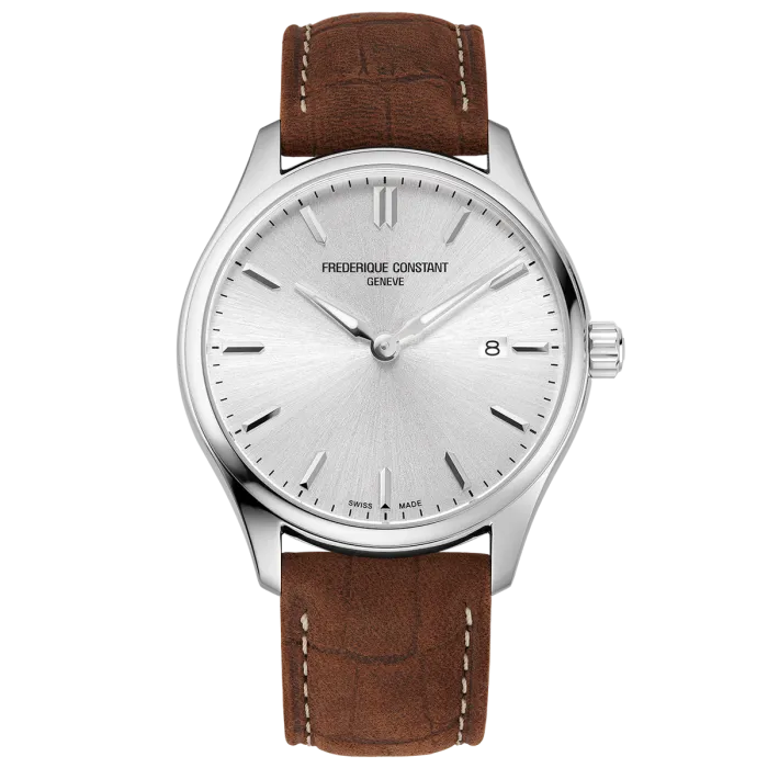 The Frederique Constant® Analogue 'Classics' Men's Watch FC-220SS5B6 is the quintessential timepiece that embodies sophistication and timeless style. Crafted for the discerning man, this watch features a stunning silver dial that captures attention while remaining elegantly understated. The sleek design is complemented by a robust stainless steel case with a perfect diameter of 40mm that comfortably wraps around the wrist, paired with a leather strap in rich brown that echoes classic luxury. The smooth texture of the leather contrasts beautifully with the polished case, offering a harmonious interplay of materials that speaks to quality craftsmanship. At just 10mm thick, the watch balances a slender profile while housing a reliable quartz movement, ensuring precision in every tick. The sapphire glass window not only protects from scratches but also adds a layer of depth to the dial, which includes a practical date feature positioned effortlessly for daily use. With a water resistance of up to 5 bars, this watch can accompany you from formal occasions to everyday activities without worry. No detail has been overlooked, with the analogue display presenting hours, minutes, and seconds with clarity, enhancing the user experience. The buckle clasp provides a secure fit while allowing for easy adjustments, ensuring that this watch is as functional as it is stylish. Whether you’re dressing up for a corporate meeting or a leisurely weekend brunch, the Frederique Constant® Analogue 'Classics' Men's Watch is the perfect accessory to elevate your look.