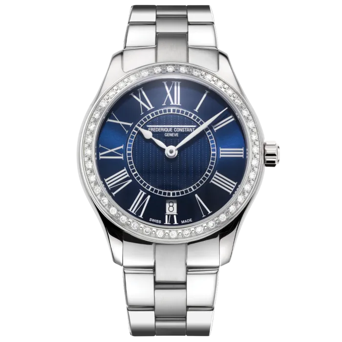 Frederique Constant® Analogue Women's Watch FC-220MN3BD6B embodies the elegance of timekeeping with a distinguished touch. This exquisite dress watch is designed specifically for women who appreciate luxury combined with functionality. Featuring a chic and sophisticated look, its 36mm round stainless steel case is beautifully complemented by a striking blue dial. The watch is adorned with sparkling stone settings that enhance its beauty and shine. Crafted with a quartz movement, it promises accurate timekeeping, making it a reliable companion for your daily endeavors or special occasions. The sapphire glass window over the dial offers superior durability and clarity, ensuring you can view the time without compromise. With a case thickness of just 8mm, it sits gracefully on the wrist, providing comfort alongside style. The stainless steel band, measuring 19cm in length and 17mm in width, is not only fashionable but also secure, featuring a deployment clasp for added ease of wear. This timepiece also includes a calendar function, enhancing its practicality for everyday use. Suitable for water resistance up to 5 bars, it’s crafted to endure various situations while maintaining its luxurious appeal. This watch is more than just a functional accessory; it’s a statement piece that embodies the qualities of grace and sophistication that Frederique Constant is known for. Perfect for the discerning woman, this timepiece reflects your impeccable taste for fine jewelry and exquisite design.