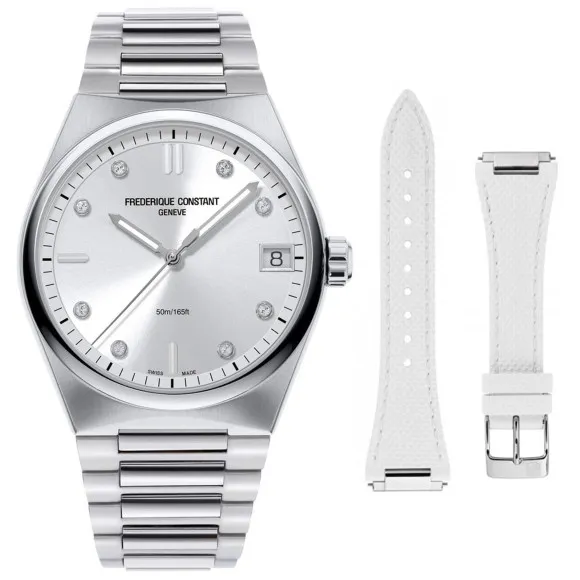Introducing the Frederique Constant Analogue 'Highlife' Women's Watch FC-240SD2NH6B, a refined accessory that embodies elegance and sophistication. Designed specifically for women, this exquisite timepiece seamlessly blends style with functionality. The round case, crafted from stainless steel, features a brilliant silver finish that adds a touch of opulence to any outfit. With a case diameter of 31mm and a thickness of just 8mm, it sits comfortably on the wrist, making it ideal for both everyday wear and special occasions. The captivating silver dial, protected by sapphire glass, showcases not only the time but also includes a date calendar feature for practicality. This luxurious watch operates via a precise quartz movement, ensuring accurate timekeeping you can rely on. The 5-bar water resistance offers an added sense of security, allowing you to wear it without worry during daily activities. The silver stainless steel band, extending to 19cm in length and 18mm in width, is both durable and stylish, beautifully complementing the overall aesthetic. The deployment clasp provides ease of wear, ensuring that this watch remains securely on your wrist throughout the day. Additionally, the adornment of diamond accents elevates the overall design, making the Frederique Constant Highlife an exceptional choice for those who appreciate fine craftsmanship. A true statement piece, this watch is perfect for enhancing your elegance, whether attending a gala or a business meeting.Shop Frederique Constant FC-240SD2NH6B at Ormoda