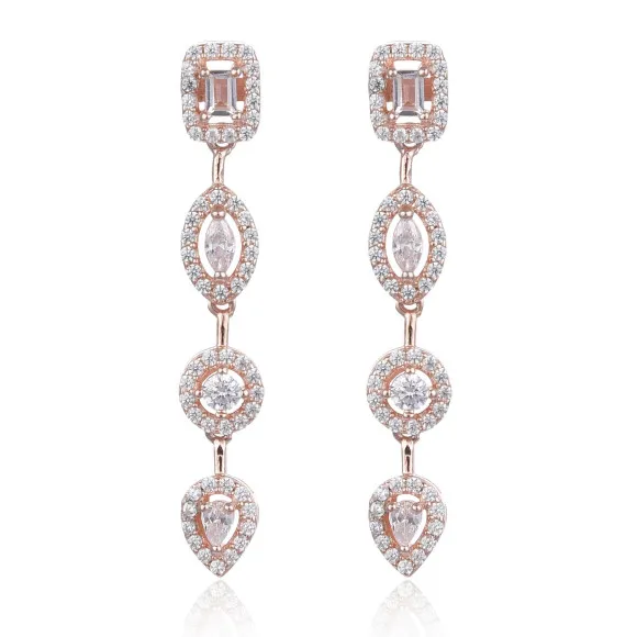 Introducing the exquisite Gena.paris® 'Gabriella' Women's Sterling Silver Drop Earrings - Rose GBO1503-R, a piece that embodies elegance and sophistication. The delicate design features eight stunning pear-shaped zirconium gems that sparkle beautifully, showcasing a pure white hue against the warm tones of rose gold. Each earring is meticulously crafted from high-quality 925 sterling silver, ensuring durability and a luxurious shine that isn't just a treat for the eyes but also an assurance of quality. With a height and length of 3.5 cm, these earrings sit gracefully while adding a touch of glam to any outfit, whether it's a casual day out or a formal evening affair. The butterfly back finding secures these earrings comfortably, allowing you to move with confidence and grace. The thoughtful combination of materials and design make them an ideal choice for women of all ages, enhancing your natural beauty while offering a unique statement piece that complements any wardrobe. The 'Gabriella' earrings are not just accessories, but an expression of sophistication and charm, perfect for gifting or indulging yourself. Elevate your jewelry collection with this timeless piece that beautifully balances elegance and modernity, ensuring you stand out in every crowd.Shop Gena.paris GBO1503-R at Ormoda