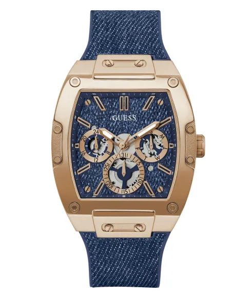 The Guess® Multi Dial 'Phoenix' Men's Watch GW0786G2 embodies a perfect blend of modern elegance and functionality, tailored specifically for the discerning man who appreciates style and precision. Featuring a striking blue dial, this watch captures attention while maintaining a professional demeanor, making it suitable for both the office and casual outings. The multi dial design not only enhances its aesthetic appeal but also allows for comprehensive timekeeping, ensuring you're always punctual. Crafted with a stainless steel case in a luxurious rose gold finish, the tonneau-shaped case adds a unique touch to your wrist. The substantial case length of 52mm and width of 43mm makes it a statement piece, while the sleek 11mm thickness ensures comfort without compromising on style. The watch is secured with a durable silicone band, also in blue, that offers both flexibility and durability, accommodating wrist sizes with a length of 21cm and width of 24mm. Its buckle clasp provides a secure fit, allowing you to wear it with confidence during any activity. This timepiece is built to withstand daily life with a water resistance of up to 5 bars, perfect for those unexpected splashes. Whether you're navigating meetings or enjoying leisure time, this watch stands out with its day-date feature, providing practical functionality for your busy lifestyle. With a reliable quartz movement powering its intricate mechanics, the Guess® Multi Dial 'Phoenix' watch is as dependable as it is stylish. Its mineral glass dial window ensures clarity and resilience, so you always have a perfect view of your timepiece's beauty while remaining assured of its longevity. Elevate your wristwear collection with this exquisite timepiece that perfectly balances sophistication and practicality.